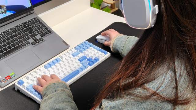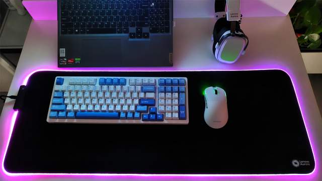 决定咱们实际游戏体验的,我想除了游戏电脑主体之外,键鼠套装或许是最为关键的,而我们这一次首先看看这联想极光的三模RGB机械键盘GK10,我们选择的是蓝白的配色,整体看上去非常简约,而且98的配列对于我目前在家中用的这个小桌子也是非常友好的。