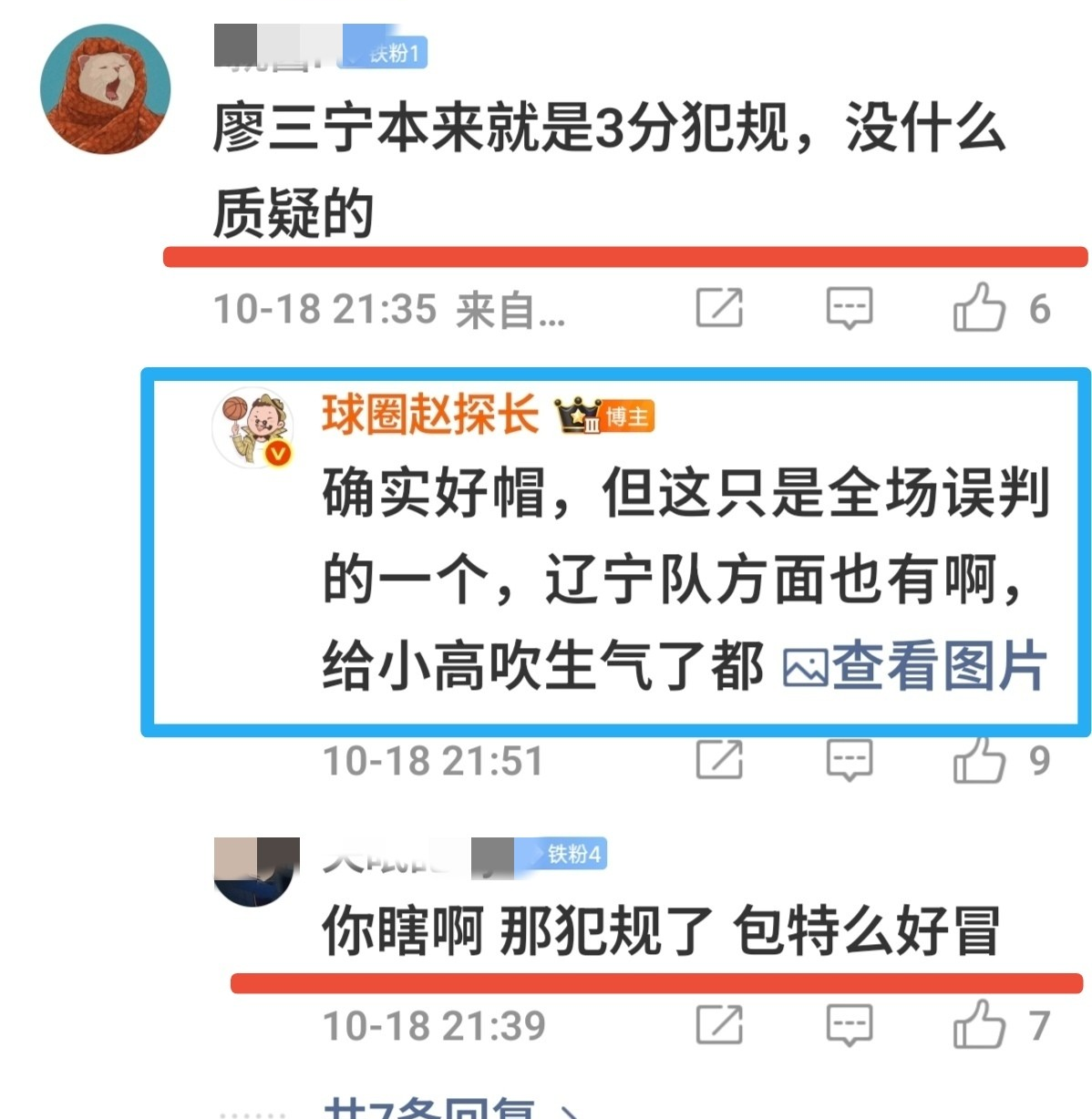 赵探长也不敢得罪辽宁球迷,只好在下面又加上一句:“辽宁队方面也有啊, 给小高吹生气了都。”