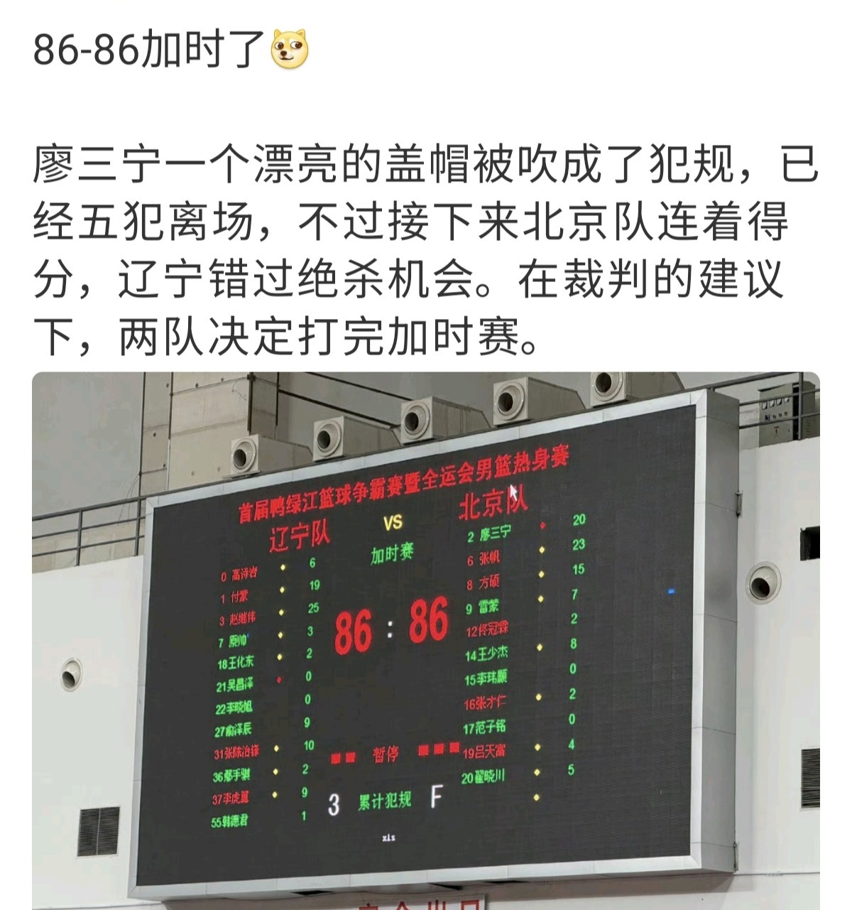 知名记者赵探长发博表示:“廖三宁一个漂亮的盖帽被吹成了犯规,已经五犯离场,不过接下来北京队连着得分,辽宁错过绝杀机会。”