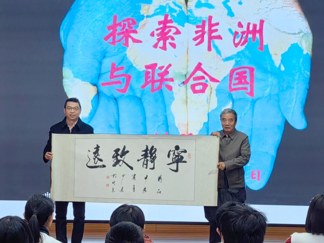 讲座开始前,林乐光校长代表学校向刘昕生大使赠送书法作品,表达对大使诚挚欢迎和感谢。随后,刘大使以非洲地理与历史为切入点,带领同学们走进这片充满活力与多样性的大陆。他从撒哈拉沙漠的壮阔、东非大裂谷的神秘,讲到古代非洲王国的兴衰与殖民历史的深远影响,帮助同学们建立起对非洲的立体认知。