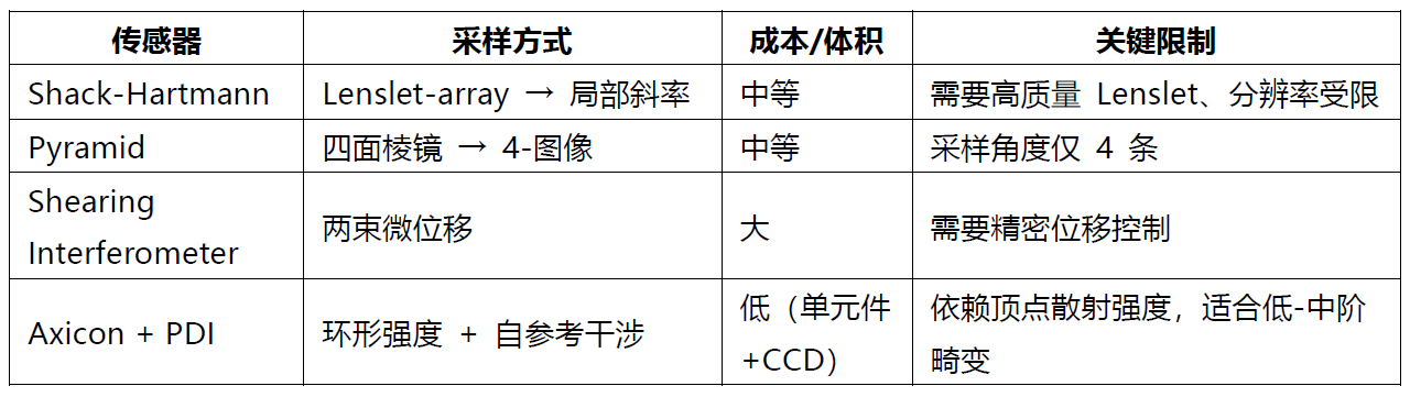 Axicon 波前传感器把传统圆锥光学元件与点衍射干涉融为一体,实现了低成本、体积紧凑、单帧实时的波前检测方案。它既能够用环形强度快速捕获低阶畸变,又能借助自参考干涉解析更高阶相位信息,完美契合当下自适应光学各种新兴场景的需求。