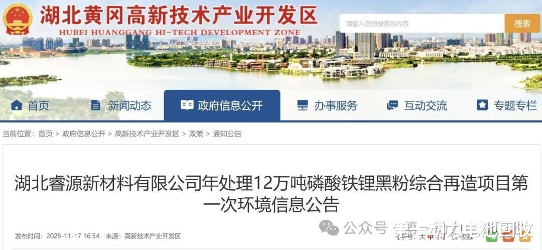 第一动力电池回收消息,近日,湖北黄冈高新技术产业开发区发布了《湖北睿源新材料有限公司年处理12万吨磷酸铁锂黑粉综合再造项目》第一次环境信息公告。
