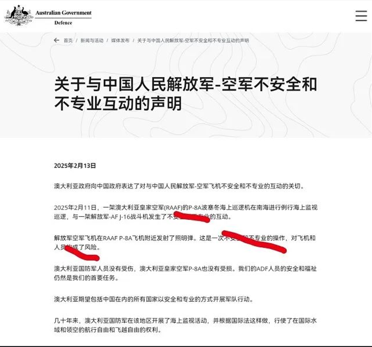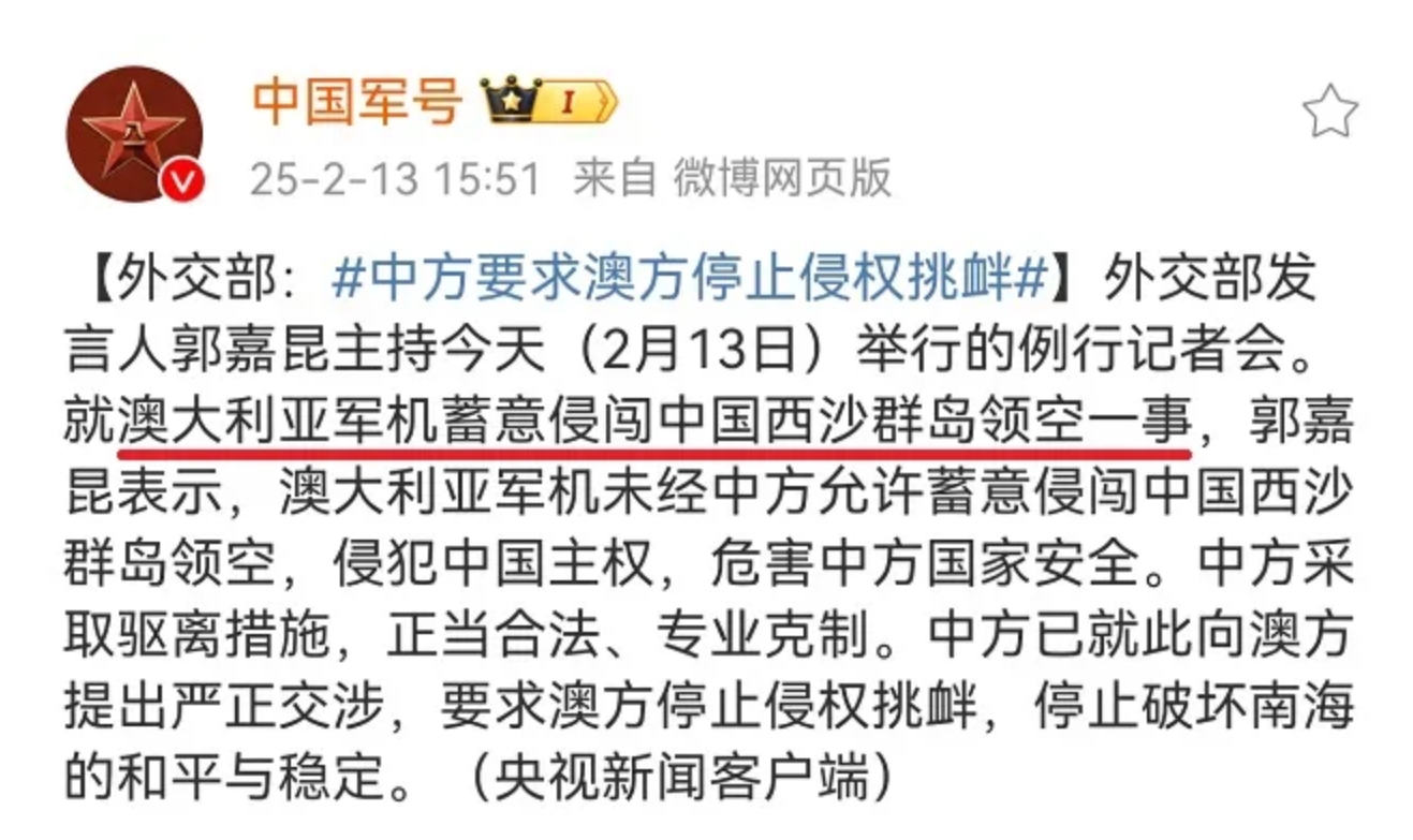 中国军号转载了外交部#中方要求澳方停止侵权挑衅#的声明,外交部发言人郭嘉昆在主持2月13日举行的例行记者会上表示,澳大利亚军机未经中方允许蓄意侵闯中国西沙群岛领空,侵犯中国主权,危害中方国家安全。