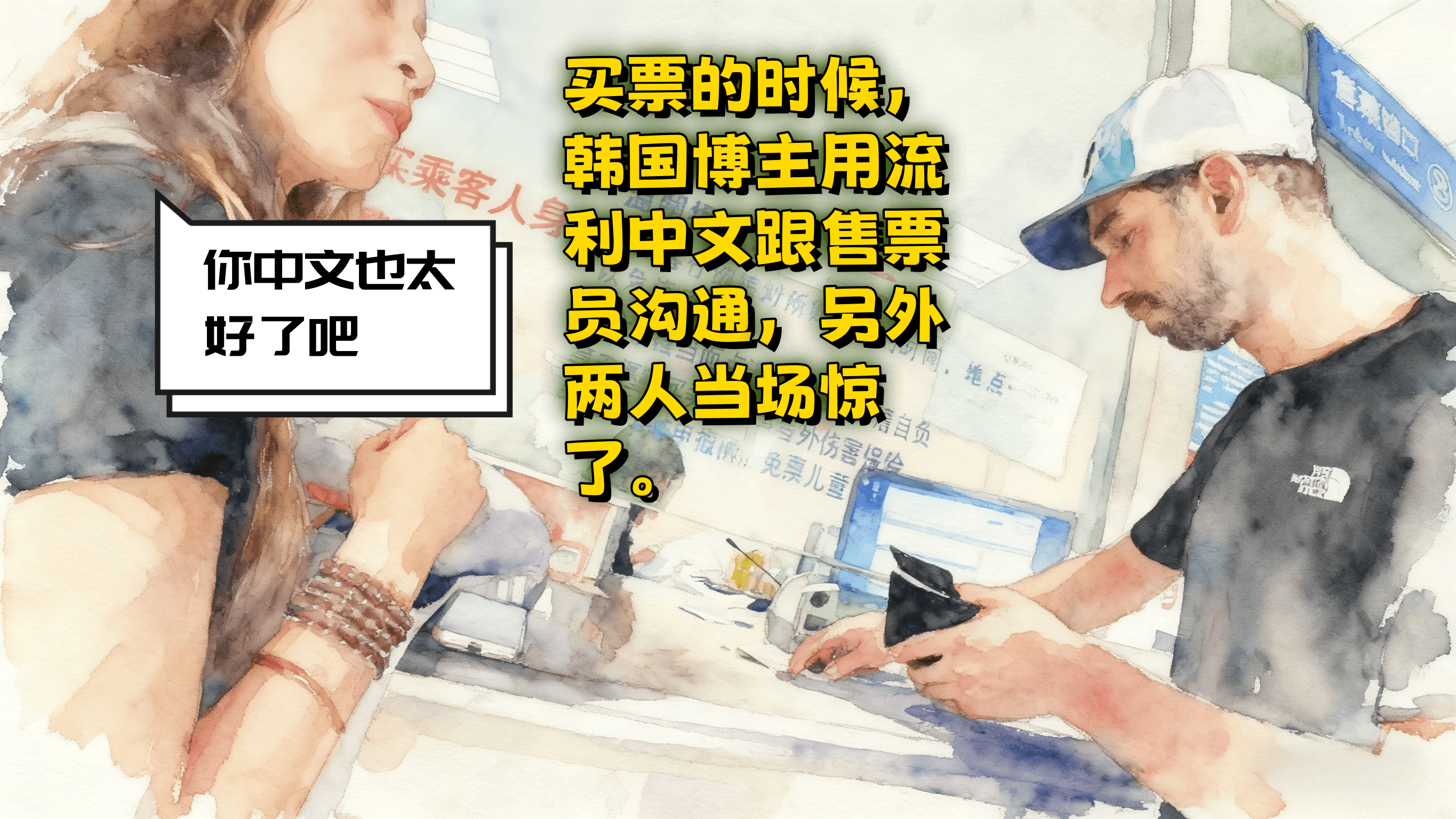 买票的时候,韩国博主用流利中文跟售票员沟通,另外两人当场惊了。