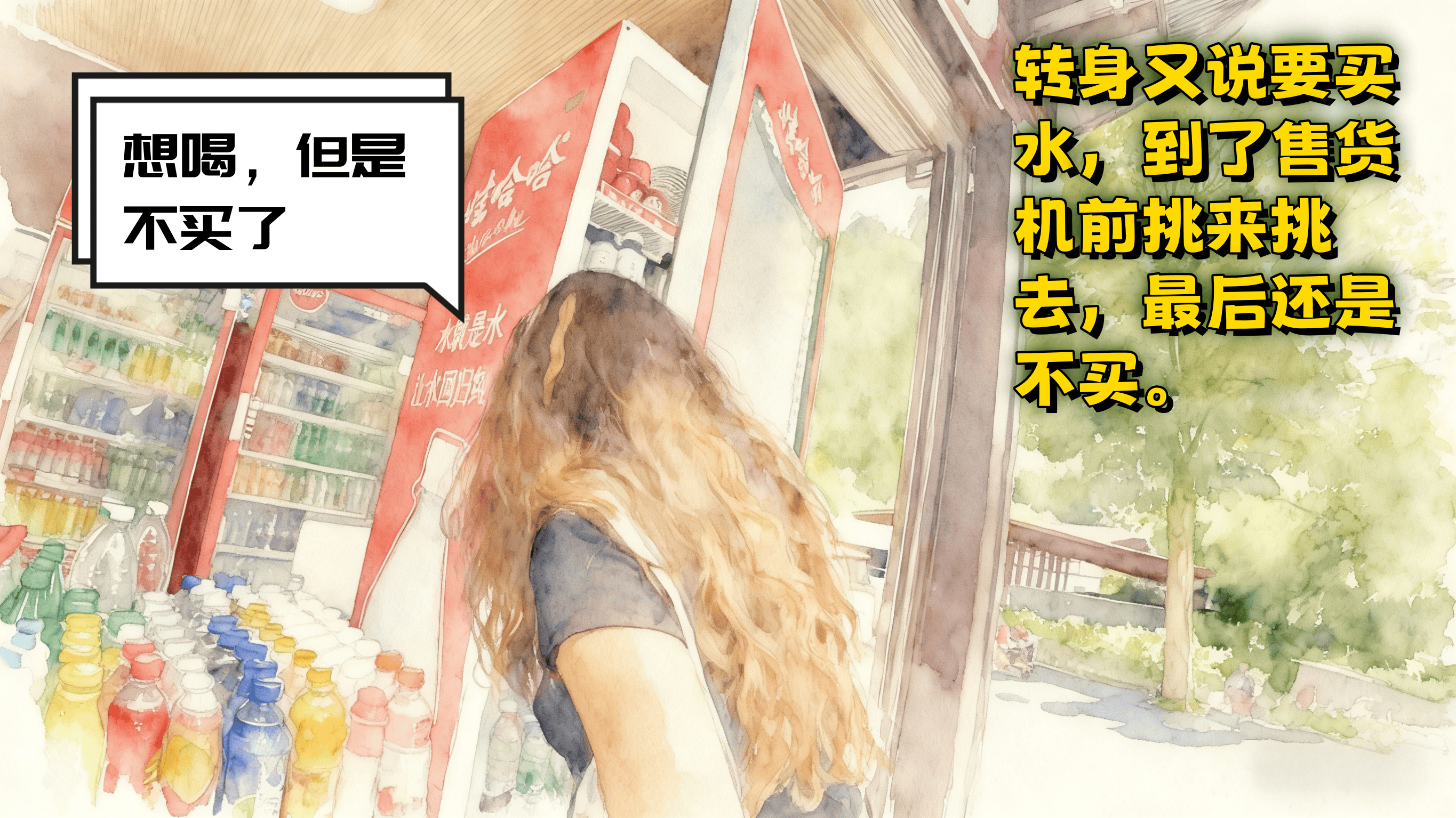 转身又说要买水,到了售货机前挑来挑去,最后还是不买。