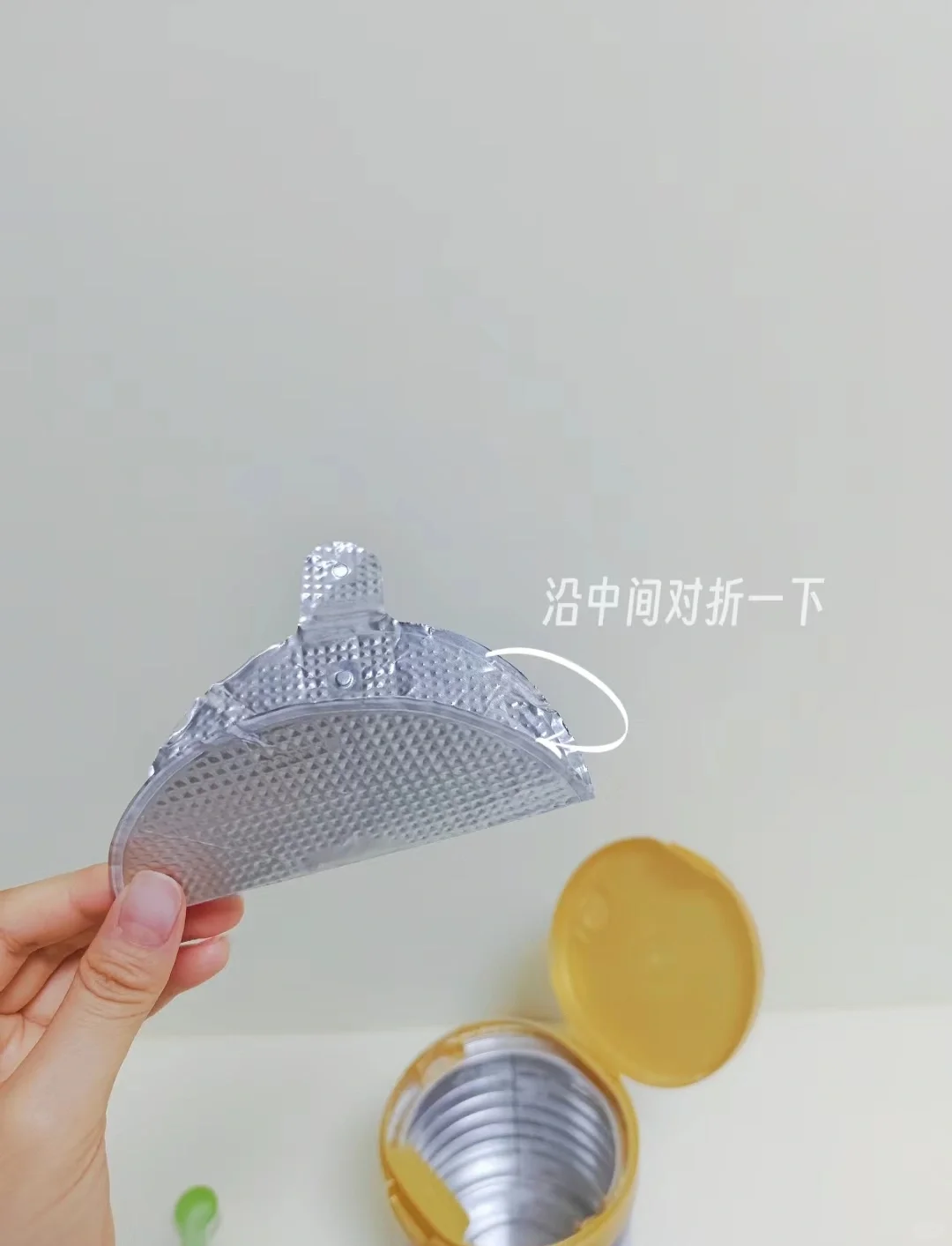 每次奶粉桶只剩下最后一点奶粉的时候用自带的勺子根本取不出来,这个时候你就可以利用上奶粉盖子了,把这个盖子对折一下。