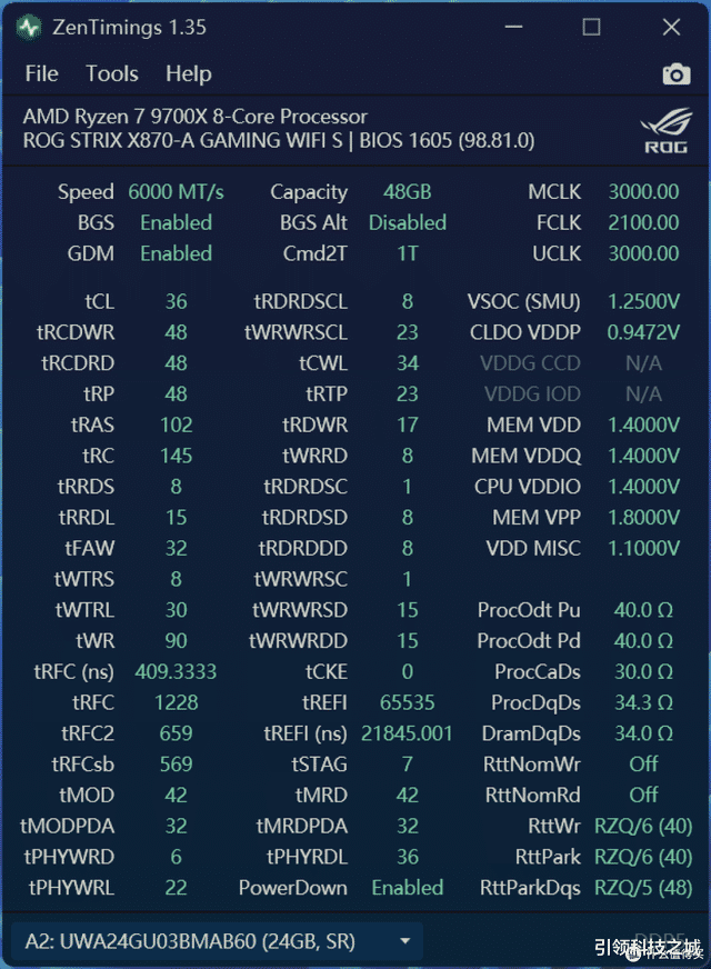 开启超频预设以及华硕主板的内存优化设置后,详细参数如图: