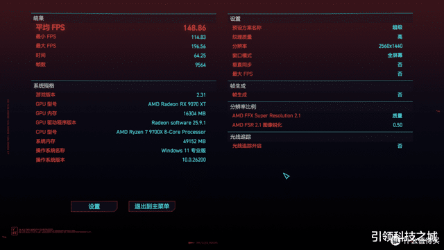 2K超级画质、光追&帧生成关闭下,赛博朋克2077平均帧率148.86FPS,最小帧率114.83FPS。