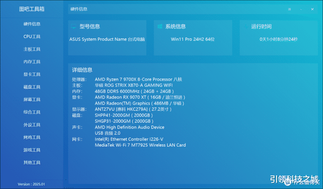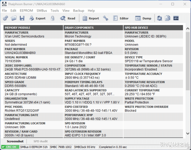 上机后一次点亮没有问题,用“台风”软件查看内存的SPD信息,我这套48GB版本采用的是美光原厂颗粒,单面布局,单颗颗粒容量为3GB,共8颗也就是24GB,两颗加一起48GB。 绫龙DDR5默认频率为5600MT/s,支持EXPO和XMP 3.0一键超频,开启后频率可以提升到6000MT/s,时序36-48-48-102,电压1.4V。