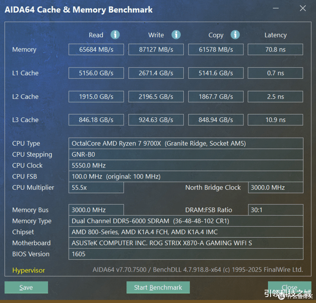 AIDA64基准跑分测试,读取速度65684MB/s,写入87127MB/s,拷贝61578MB/s,延迟70.8ns。追求极限性能的话,建议自己手动超频,美光颗粒+多层PCB堆叠这套方案,超频潜力其实不错。