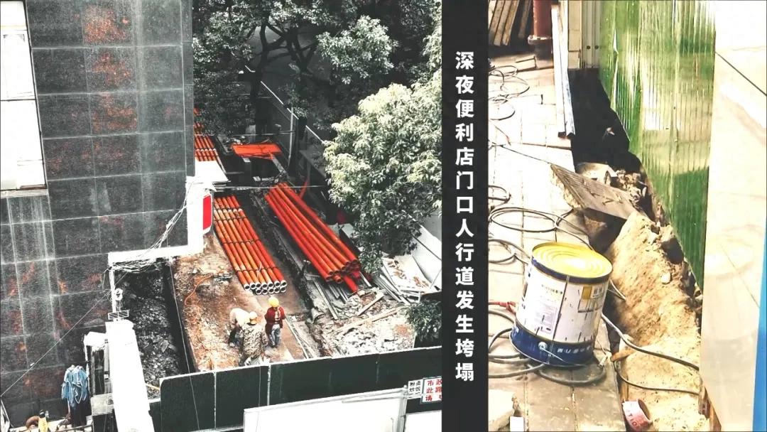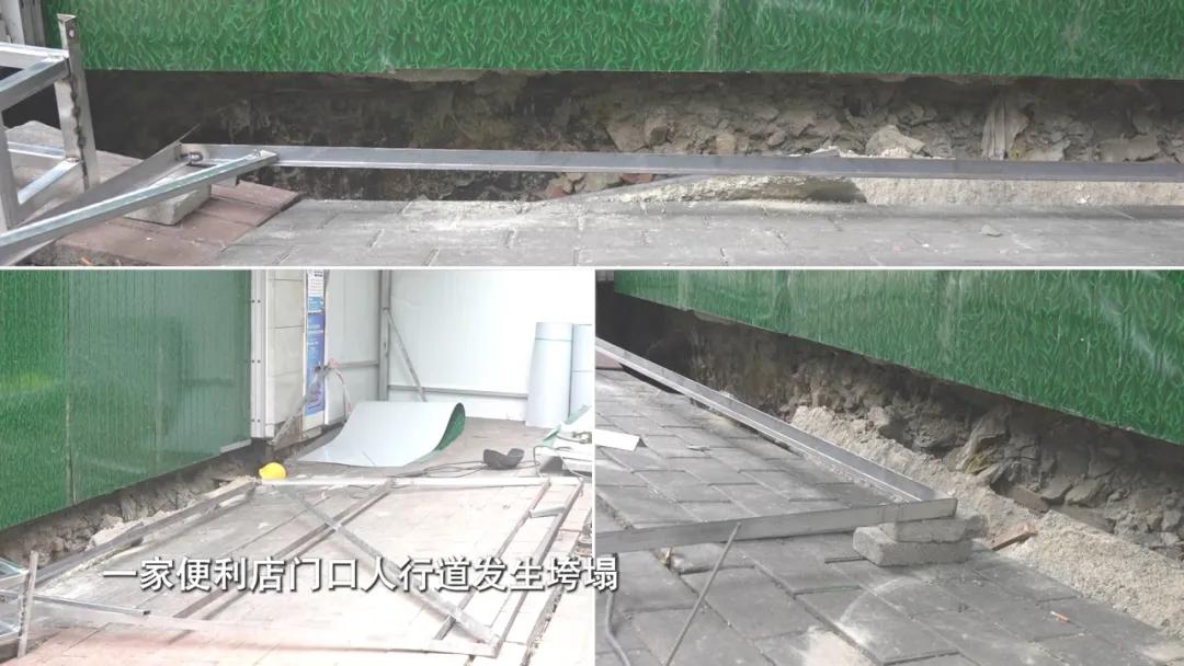 凯辉便利店老板 葛洋:(10月)16日我感觉这个人行道地形变化比较突出。门面接缝的地方有塌陷有裂口,我就打市政电话12345反映了这个情况。(10月)20日的凌晨两点这个人行道就塌陷了,大概有半米左右,我门面的自动门也垮塌了,幸好没有砸到过路的人。