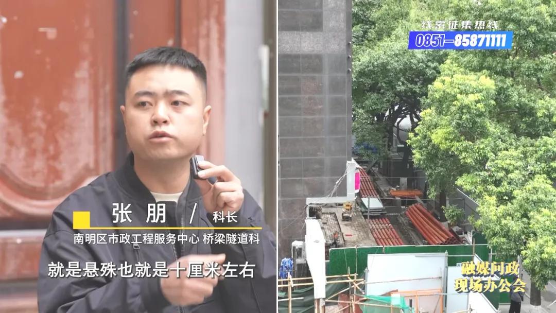 南明区市政工程服务中心 桥梁隧道科科长 张朋:第一时间属地(街道)办事处现场照相发在我们工作群里,南明区的城运集团正好在这边建设,当时我们和他们对接,先由他们进行现场观测,因为不清楚下面什么情况,然后请第三方的检测单位进来,在周一的凌晨便利店老板发现垮塌问题,早上9:10左右,我们立即赶到现场进行勘测,根据他们出的报告和物业进行联系,我们建议门面先暂停营业,怕再发生垮塌,造成二次伤害。