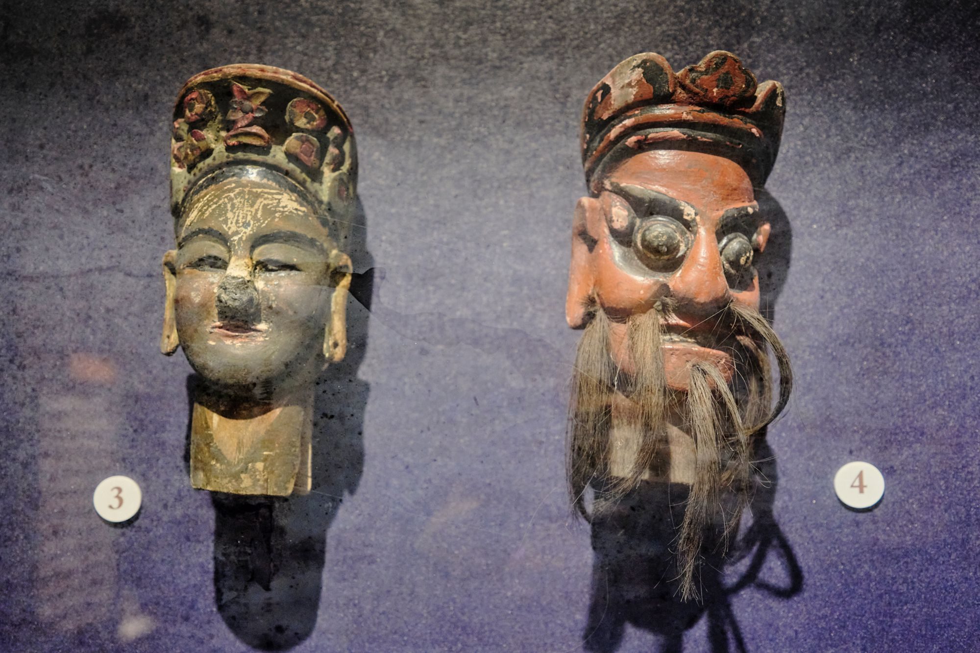 铜仁德江傩戏是第一批列入我国国家级非物质文化遗产名录的项目,源于古时的傩仪,汉代以后发展成为具有浓厚娱人色彩的礼仪祀典。展柜中陈列的傩戏面具神态各异,一个温婉祥和,一个威严刚猛,分别对应着傩戏中的不同角色。