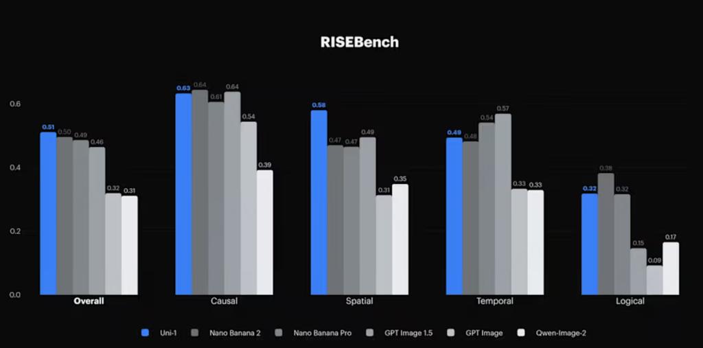 二、关键跑分:推理能力拉开差距,逻辑推理得分翻倍基于推理的视觉编辑的基准测试工具RISEBench从时间、因果、空间和逻辑四大维度对图像生成AI进行了跑分,Uni-1综合分0.51,谷歌Nano Banana 2得分0.50,Nano Banana Pro是0.49,OpenAI GPT Image 1.5是0.46。总分看着咬得很紧,我们可以聚焦不同维度来比一比: