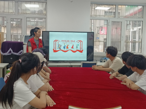 图: “青春不打烊”志愿服务队全体成员听社区志愿者宣传讲解“中华民族一家亲”(张澈、刘嘉仪 供图)