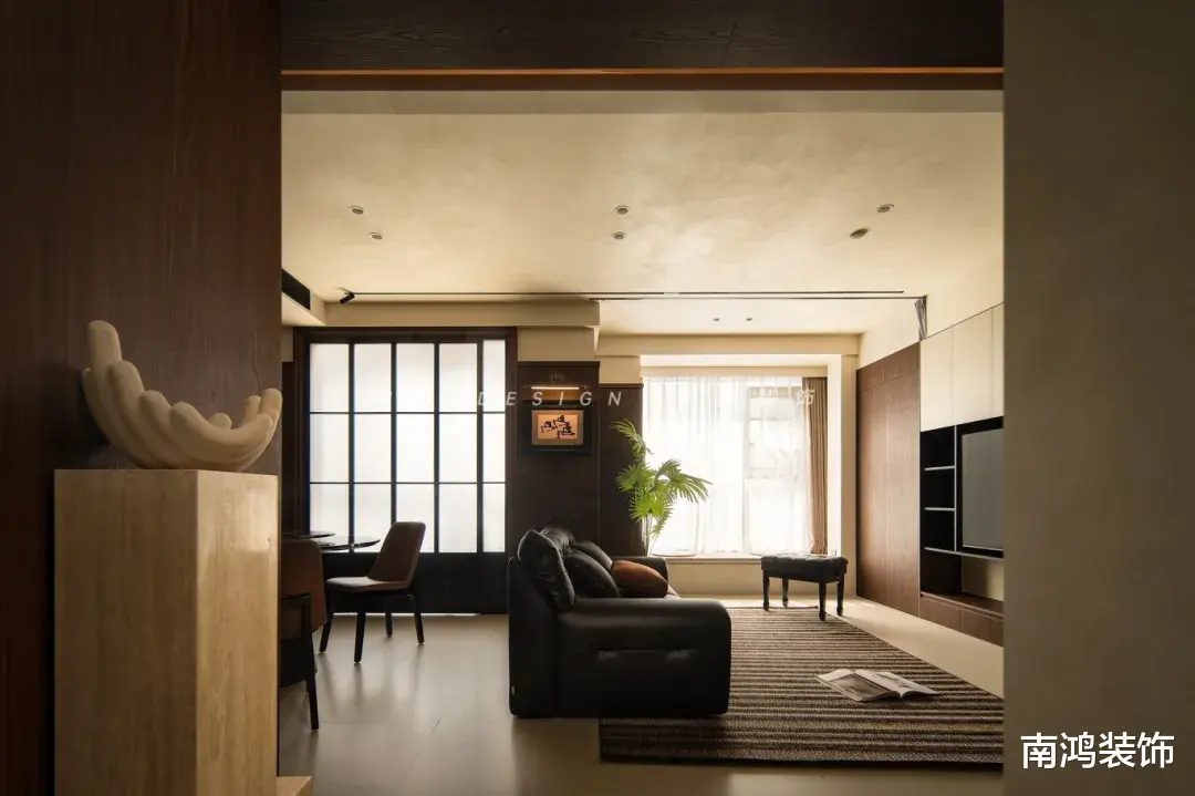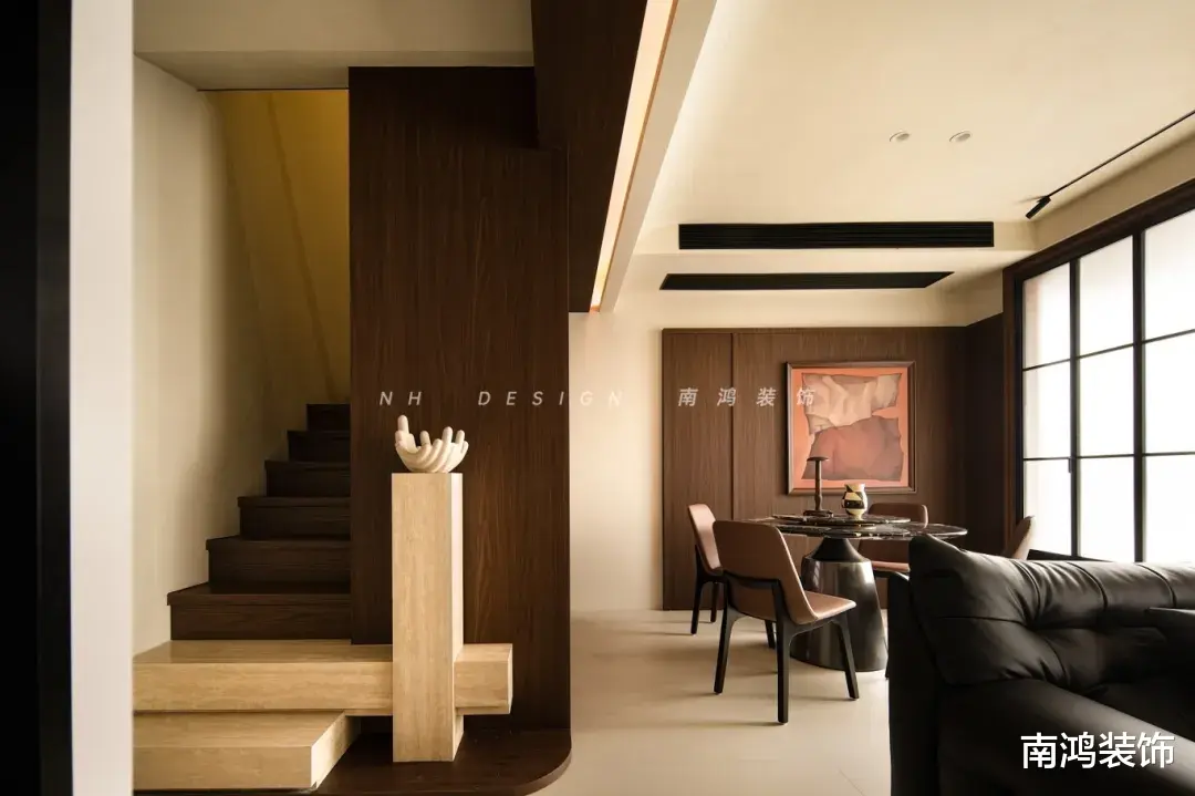 本案正是这样一次风格的精准落笔。在斑驳的艺术漆底韵之上,黑色与深胡桃木色铺陈为主调,自然、朴拙而又不失筋骨。