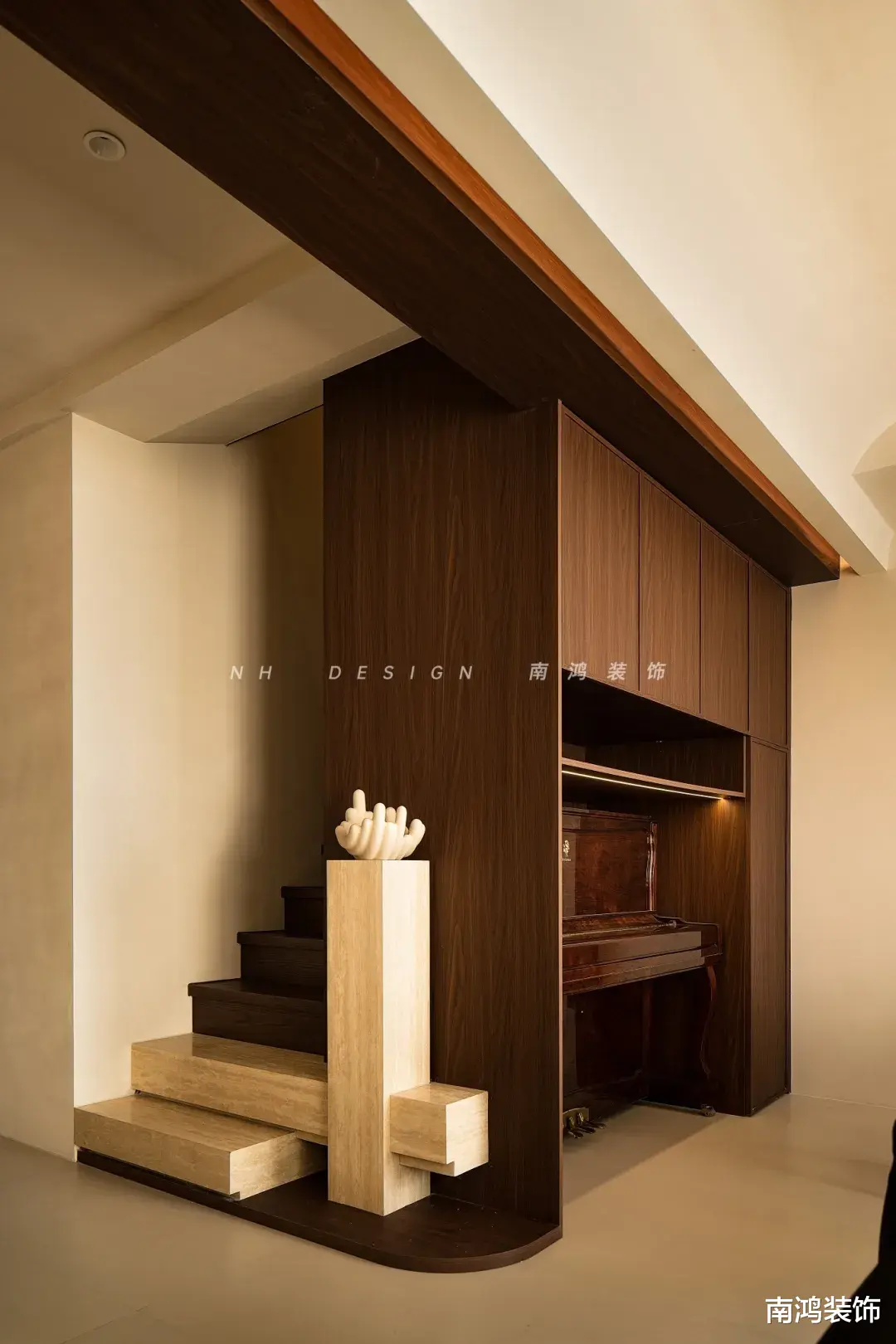 楼梯在起步的前两层台阶使用温润又显高级的洞石材质打造,并顺势延伸出一方端景柱台,洞石的天然质感与艺术摆件相辅相成,也让楼梯口区域就此成为家中一处美妙的风景。