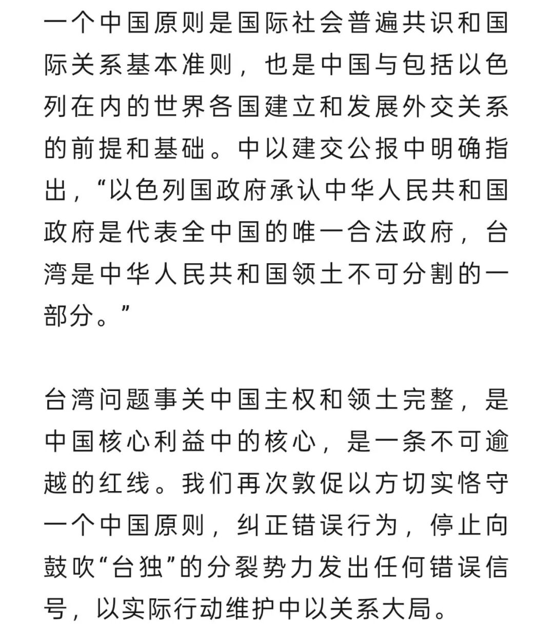 中方指出,一个中国原则是国际社会普遍共识,也是中以建交的政治基础。使馆敦促以方恪守一中原则,纠正错误行为,停止向"台独"势力发出错误信号,切实维护两国关系大局。