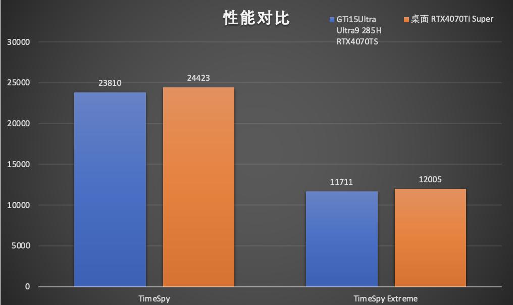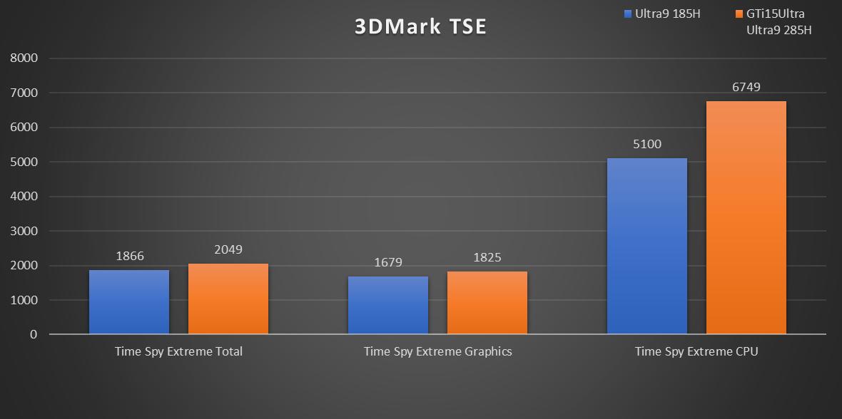 相比 Ultra9 185H,零刻 GTi15 Ultra9 285H 的 Arc 140T 核显是一个正常的小迭代,DX12 的 3DMark Time Spy 中,GTi15 Ultra 的图形分提升7.1%,CPU 得分提升了23.8%。对于更吃 CPU 性能的网游来说,Ultra9 285H 的 CPU 提升可以获得更高的平均帧数和帧数稳定性,而更吃 GPU 的 3A 游戏也可以获得7%左右的理论提升。