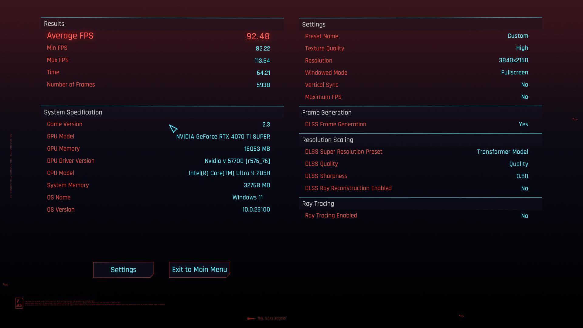 在压力更高的黑神话悟空和赛博朋克2077中,不开光追+开启 DLSS 最高画质下平均帧率可以达到92.48帧/秒,但在开启光追的情况下则只能做到51.1帧/秒。