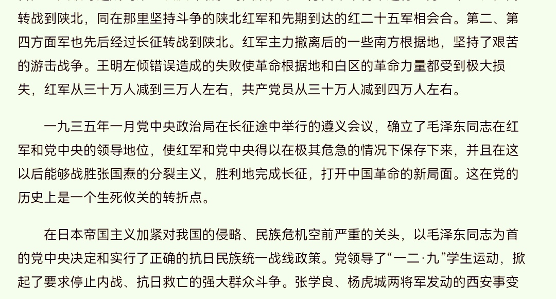 “于是广大的反对“左”倾路线的干部和党员,都在毛泽东同志的领导下团结起来,因而在一九三五年一月,在毛泽东同志所领导的在贵州省遵义城召开的扩大的中央政治局会议上,得以胜利地结束了“左”倾路线在党中央的统治,在最危急的关头挽救了党。