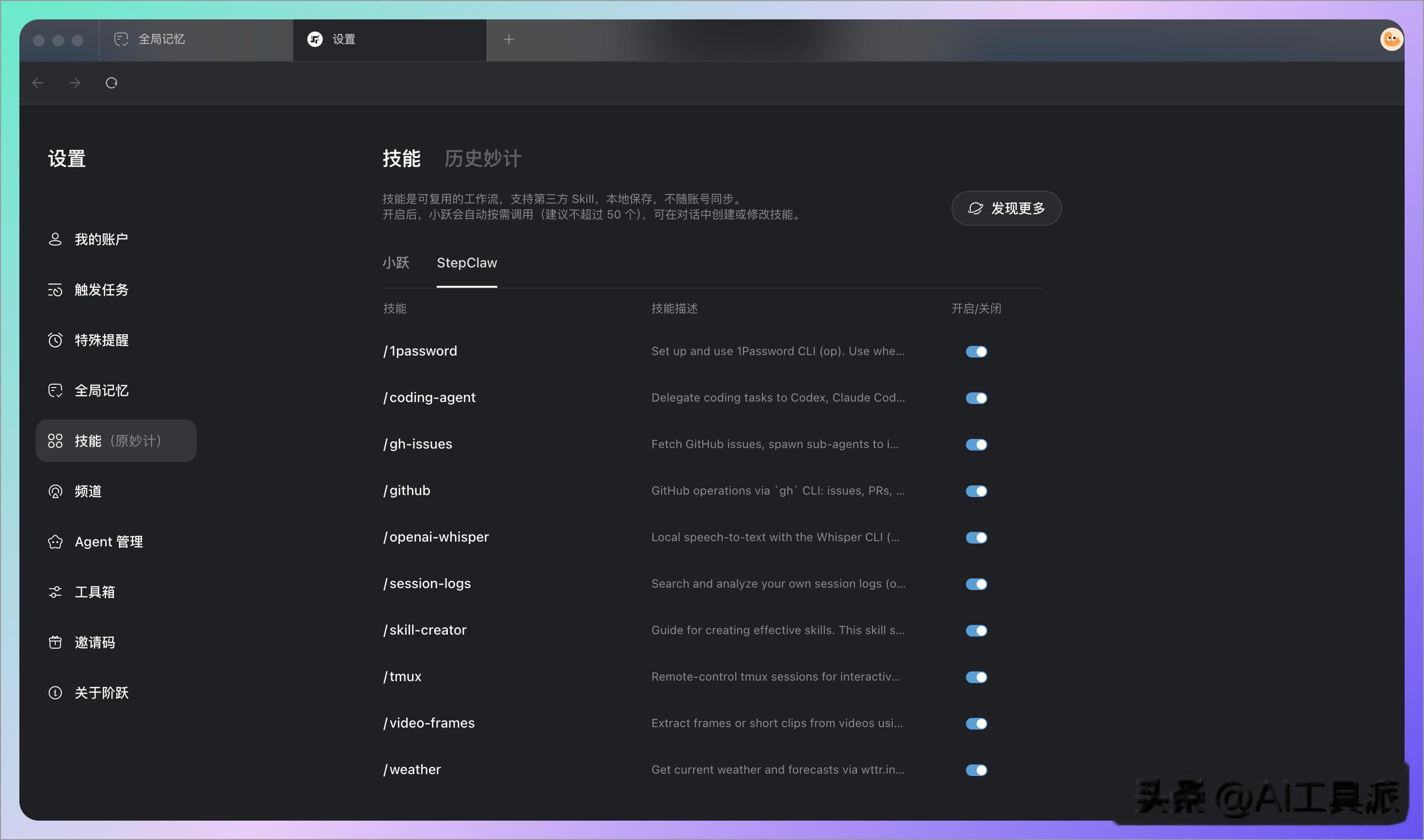 传统的 AI Agent 需要你反复“喂”上下文,说一句话它处理一句,下一次对话又回到了空白状态。而 StepClaw 有一个“全局记忆”能力,它能通过日常每一次对话、任务执行记录,精准捕捉用户的使用偏好、工作习惯,甚至能自动复盘自身的能力缺漏,主动去“水产市场”搜索相关技能补齐短板。