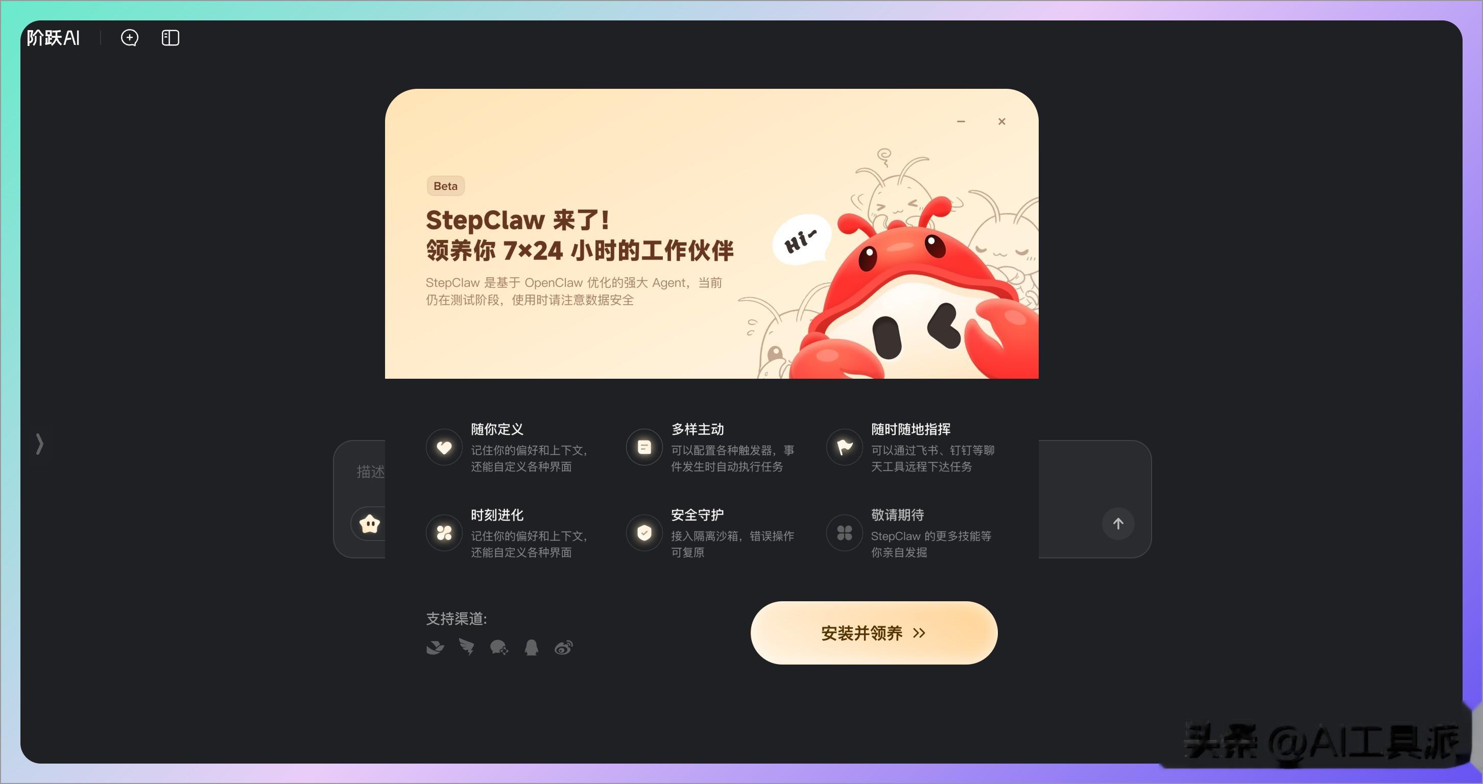 快速上手首先打开官方下载页 https://www.stepfun.com/download 下载并安装,首次启动后,界面会提示你领养 StepClaw,点击安装并领养即可: