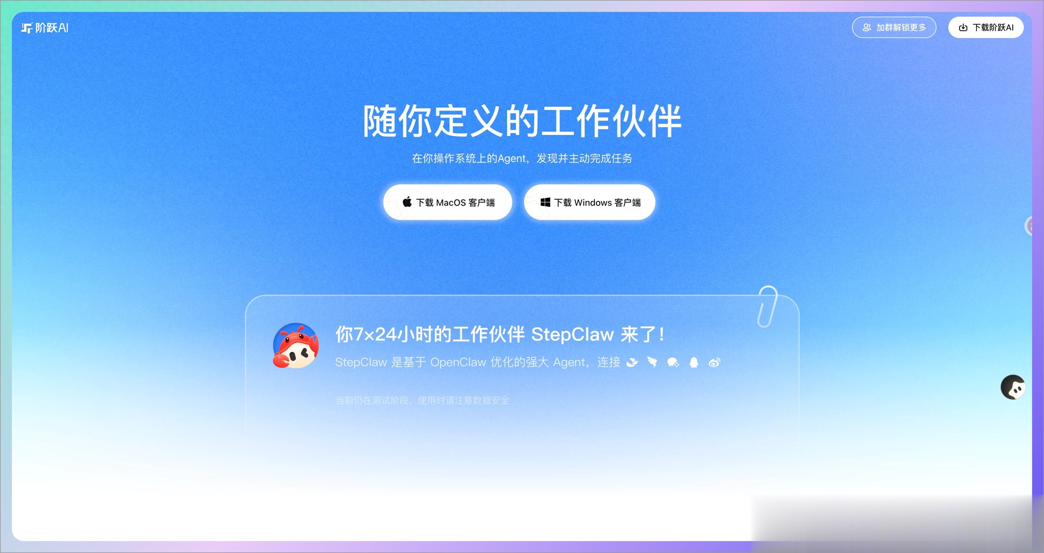 StepClaw 真正做到了“一键领养”,下载阶跃 AI 桌面端,点击安装,然后你的桌面上就会蹲着一只 7×24 小时待命的AI小助手。