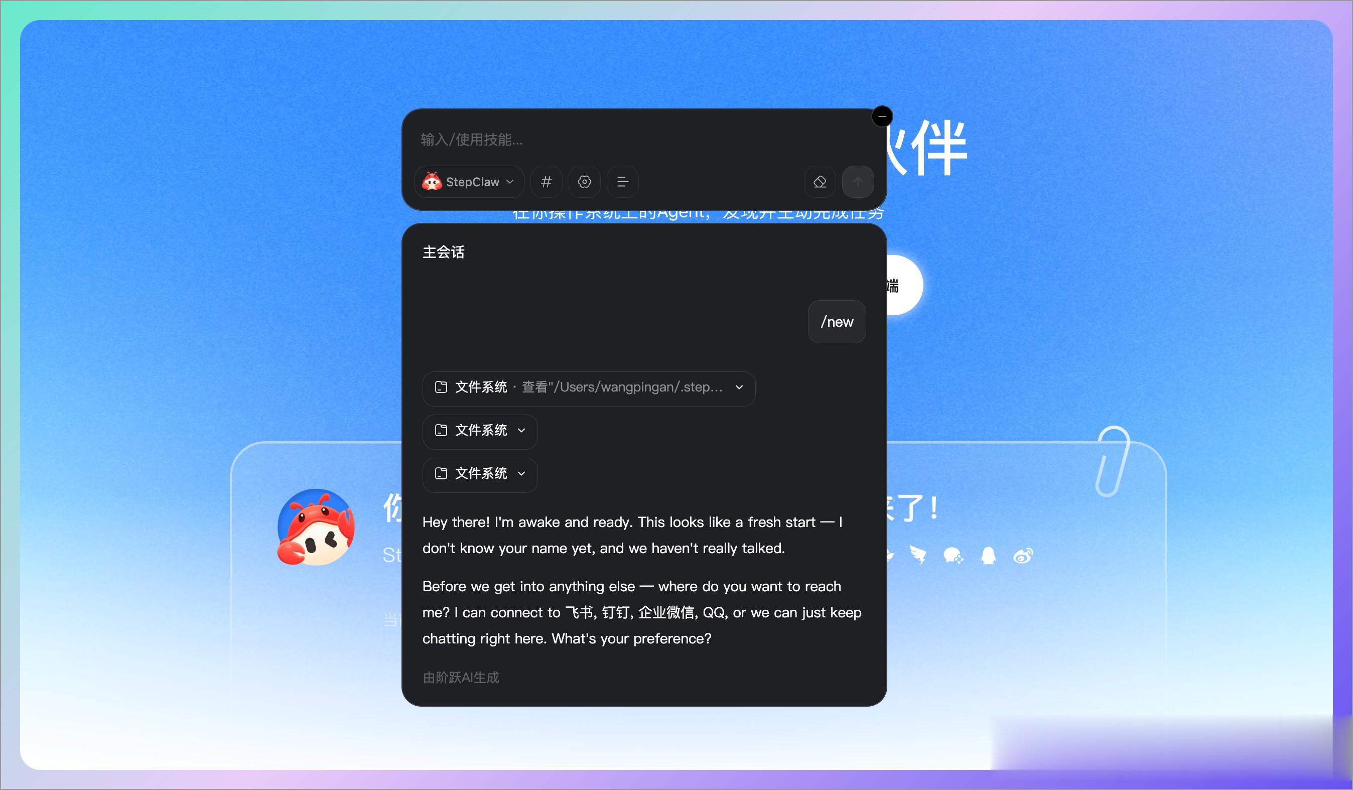 接下来在你桌面上,就会有一个小星星的图标按钮,打开可以看到 StepClaw 小龙虾对话窗口: