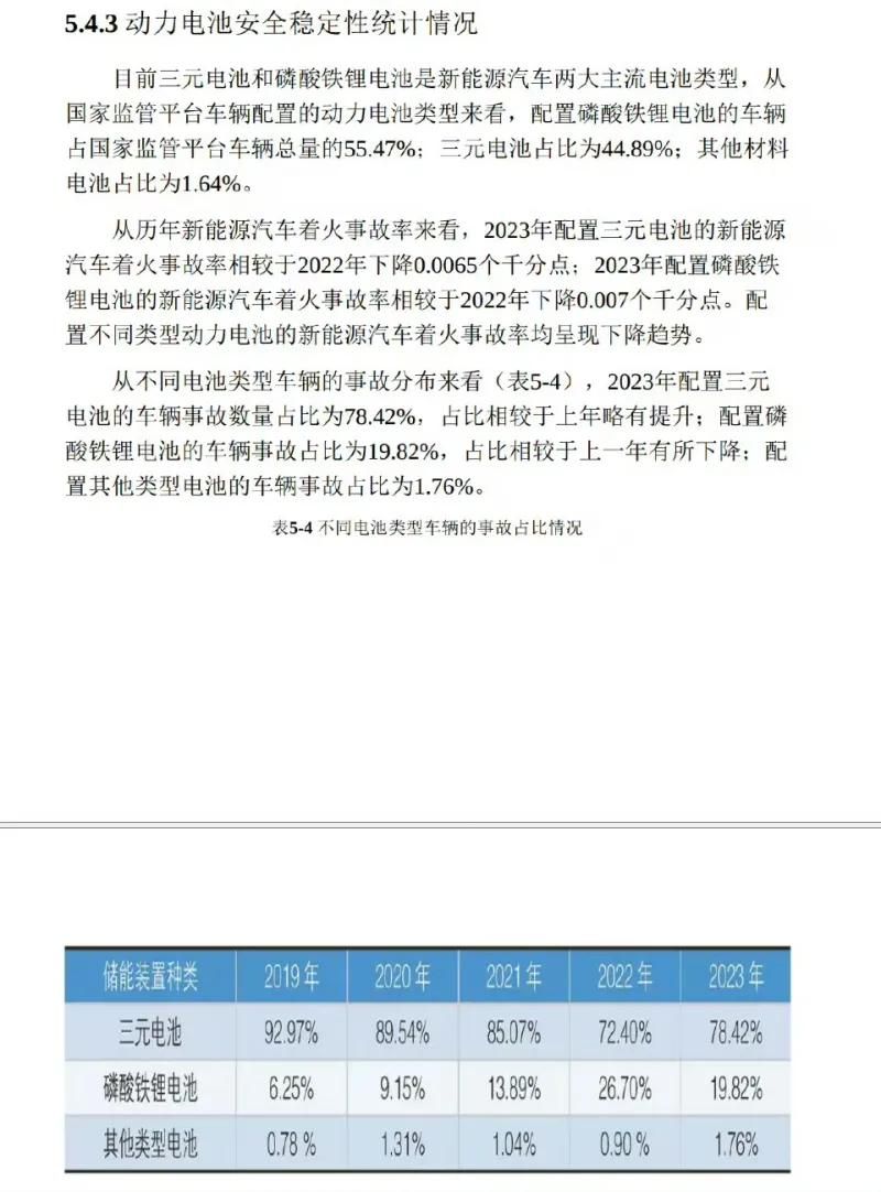 2023年配置三元电池的车辆事故数量占比为78.42%,占比相较于上年略有提升,配置磷酸铁锂电池的车辆事故占比为19.82%,看到差距了吗?在新能源汽车之中占比超过55%的铁锂新能源,起火事故的占比不到20%,其他都是三元锂电池的车烧的,所以在起火概率上,磷酸铁锂电池是远低于三元锂电池,这一点没有疑问吧?