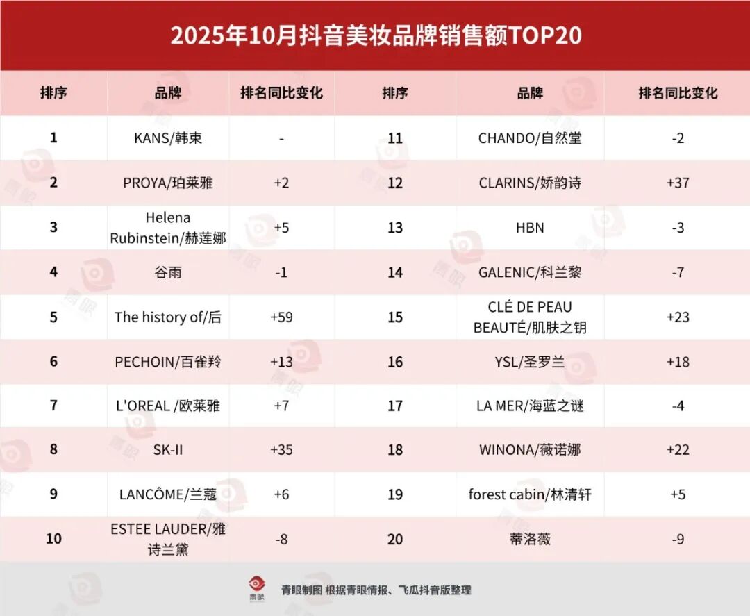 与此同时,在10月的抖音美妆品牌TOP20榜单中,排名提升最为显著的前三位分别是The history of/后、CLARINS/娇韵诗、SK-II,分别跃升至第5、第8和第12名,较上月分别上升59位、37位和35位,增幅均超过30个位次。