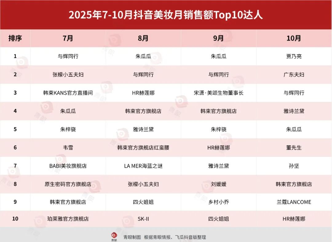 尽管广东夫妇展现出强劲的带货实力,但本月“美妆达播TOP1”的桂冠由贾乃亮摘得。这也是他在今年前十个月中,继6月之后第二次登上该榜单首位。