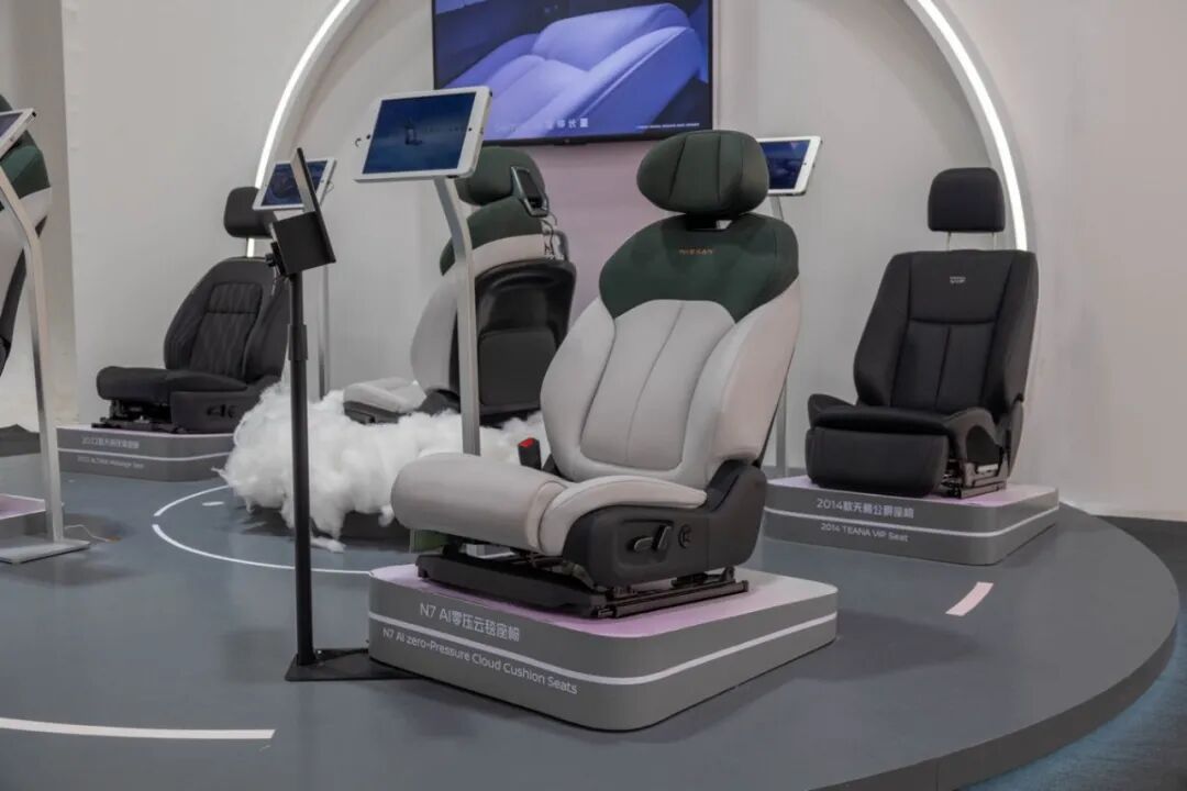 甚至在座椅配置这一项上,日产 N7 还有自家最强的“AI 零压云毯座椅”, 49 个传感器+ 19 个独立气囊 + 10 L 大流量气泵,宣称可以根据每一个人的身高体重等特点,把座椅调节到最舒服状态,而天籁·鸿蒙座舱拥有的,也仅仅是具备多向电动调节的传统零重力座椅而已。