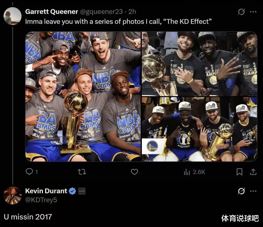 网友A晒出勇士在杜兰特加盟前中后三个时期分别夺冠的图片,并配文:“这个就叫做杜兰特效应。”杜兰特回复:“你漏了2017的照片。”网友B跟进回复:“重点是他们有你没你都能夺冠,他们根本不需要你。”杜兰特回复:“重点是我们都是冠军,为啥要生气呢?”