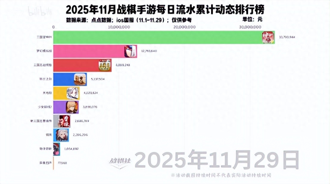 就在这两天,上线仅月余的三国题材战棋类新游《三国望神州》交出了一份亮眼成绩单。据B站up主“战棋社”发布的11月IOS国服战棋手游流水动态排行榜显示,《三国望神州》和上个月一样稳居收入榜首,用实打实的数据证明了在玩家群体中的高认可度。