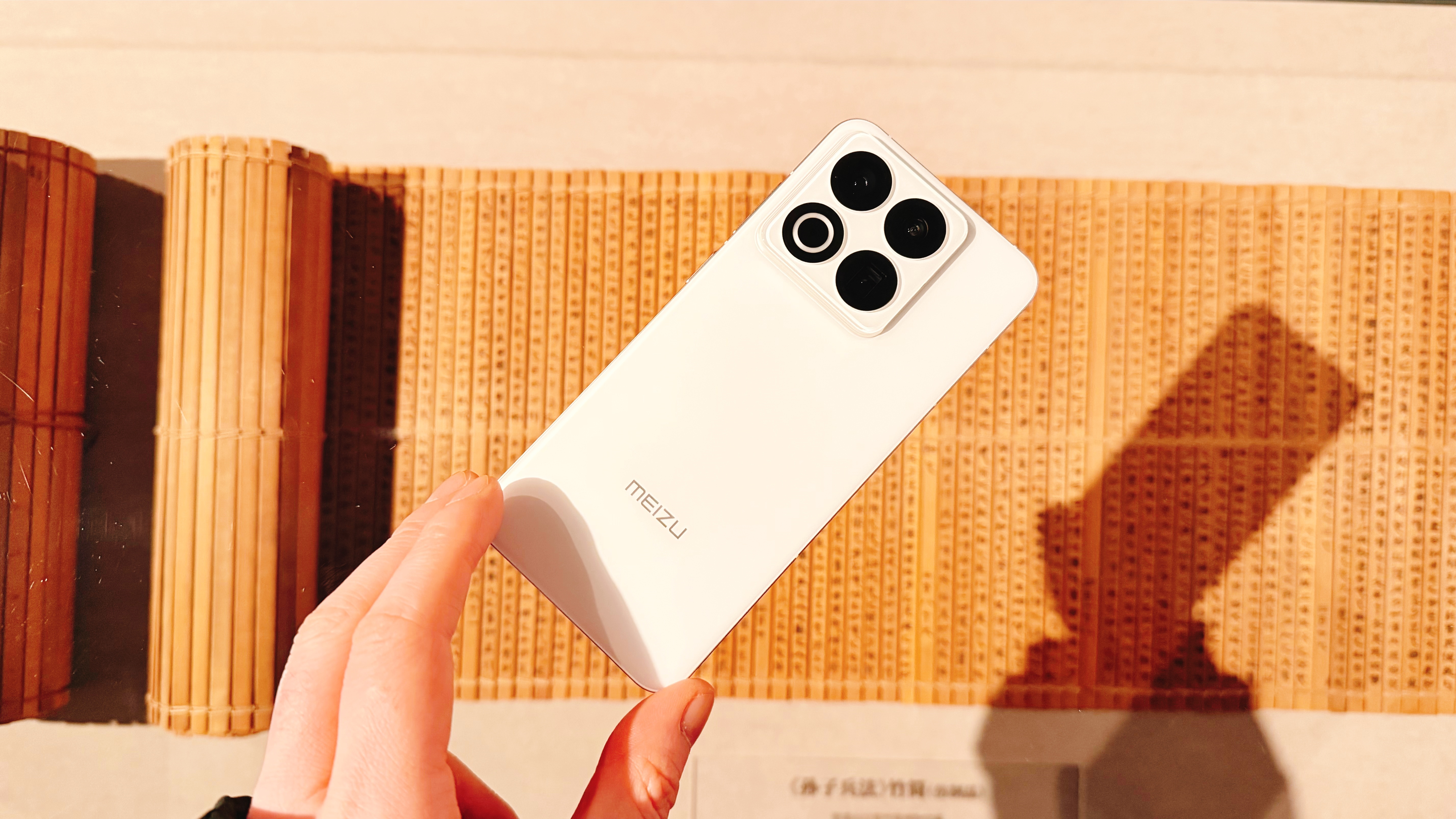 魅族 22 的瓷感机身映着竹简墨痕,3D 等深四曲后盖贴合掌心,对称式矩阵设计恰似简牍规整肌理。无界黑 / 魅族白配色与古卷底色浑然相融,极窄边框让屏幕仿佛悬浮于汉魏风雅中,每一处线条都呼应着简牍刻痕的利落。