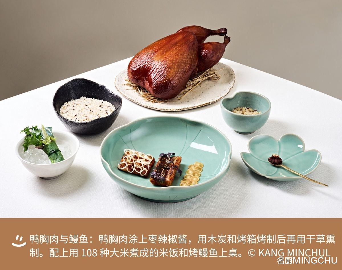 姜旻彻有一道“鱼子酱拌饭”,采集 108 种米拌腌菜,缀以韩国酱油腌制的生蛋黄以及鱼子酱。
