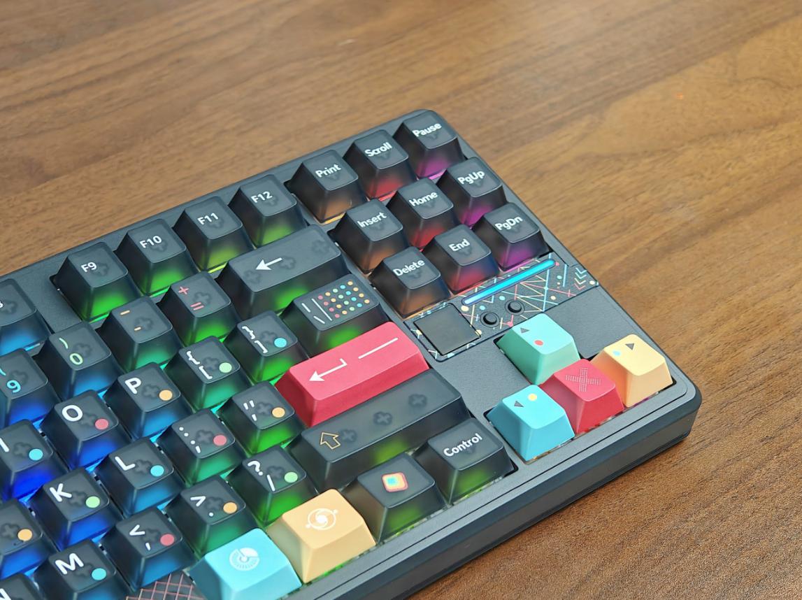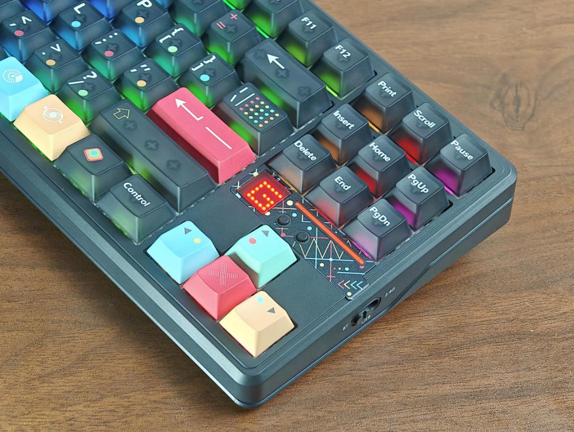开箱之后,最抓眼球的就是键盘右侧的7×7点阵屏。别小看这小方块,它不只是装饰,而是真能互动的。出厂自带了15种动画,插上电脑就能看到小表情、波纹、跳动的特效,甚至还能自己DIY,导入喜欢的GIF,直接把键盘玩出个性化。
