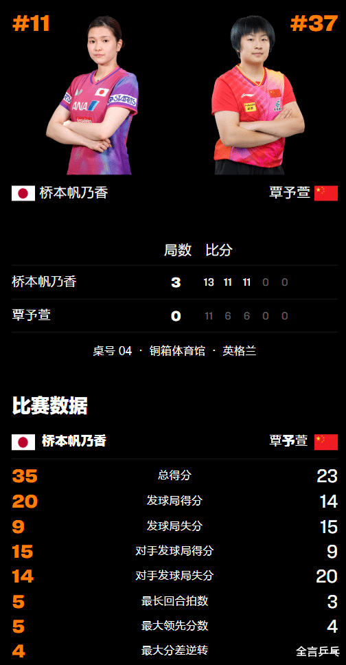 比赛开始后,覃予萱率先通过台内控制等方式取得5-1领先的优势,随后桥本帆乃香以旋转变化逼国乒小将失误得分,很快便追至6-6平,紧接着7-6再次领先后连输2球被反超,关键时刻覃予萱顽强追至8-8、9-9,随后10-9、11-10率先拿到局点但没把握住机会,最终以11-13惜败先丢一城。