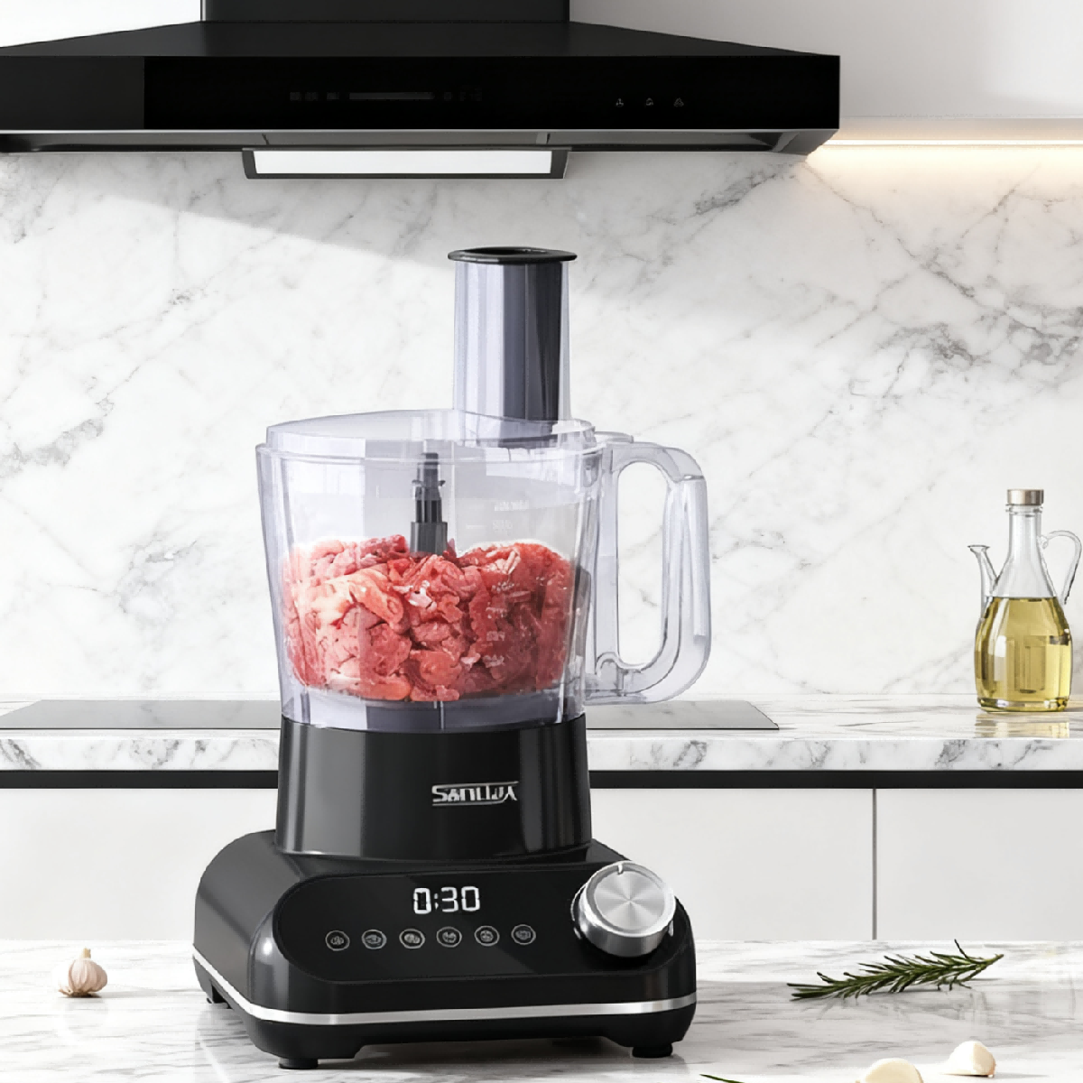 推荐理由:Sanlida搅拌机采用黑色机身搭配透明加厚搅拌杯,外观稳重,2.5L的大容量适合一次性处理较多食材。高功率电机配合多档调速功能,可灵活应对不同硬度的肉类与蔬菜,搅拌效率高。刀片锋利、打碎速度快,但清洗需格外注意安全,内部结构较深容易藏污。整体性能不错,适合家庭量备餐使用,但若想长期制作宠物鲜食,建议选择专业宠物料理机,更好清洗也能保留更多营养。
