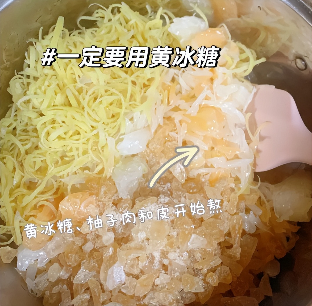 接下来就开始制作蜂蜜柚子茶,把焯水后的柚子皮加柚子肉,黄冰糖开始熬煮,一定要用黄冰糖,不要用白冰糖。