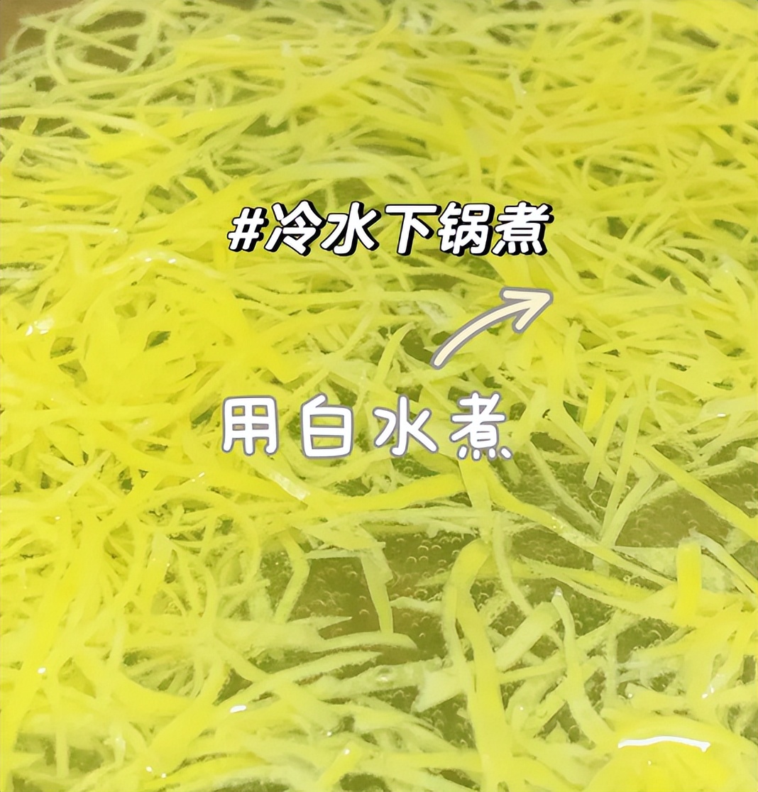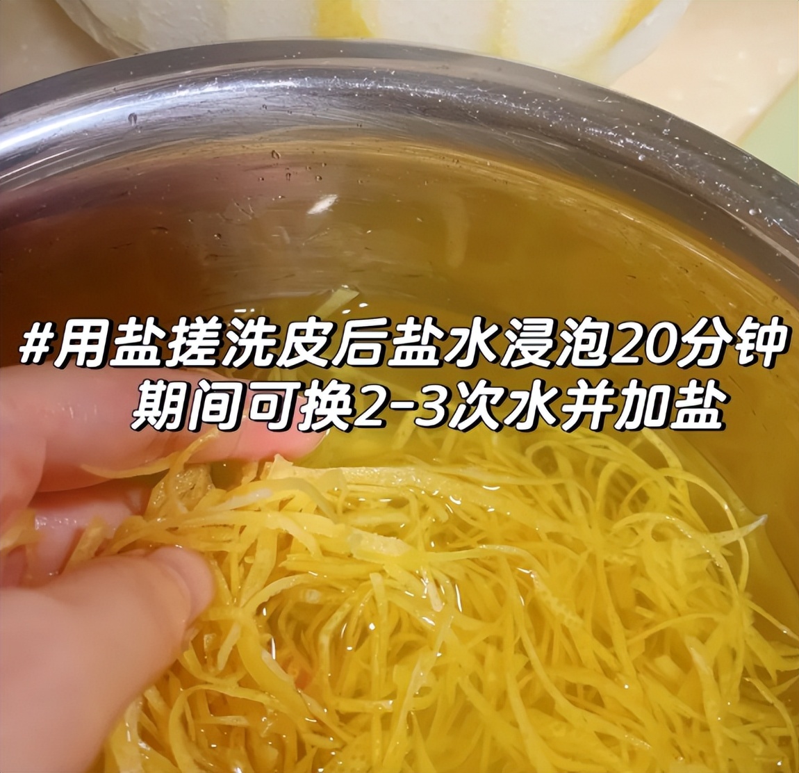 柚子皮用盐搓洗之后切成丝,再用盐水浸泡20分钟,期间可以换两三次水并加盐。