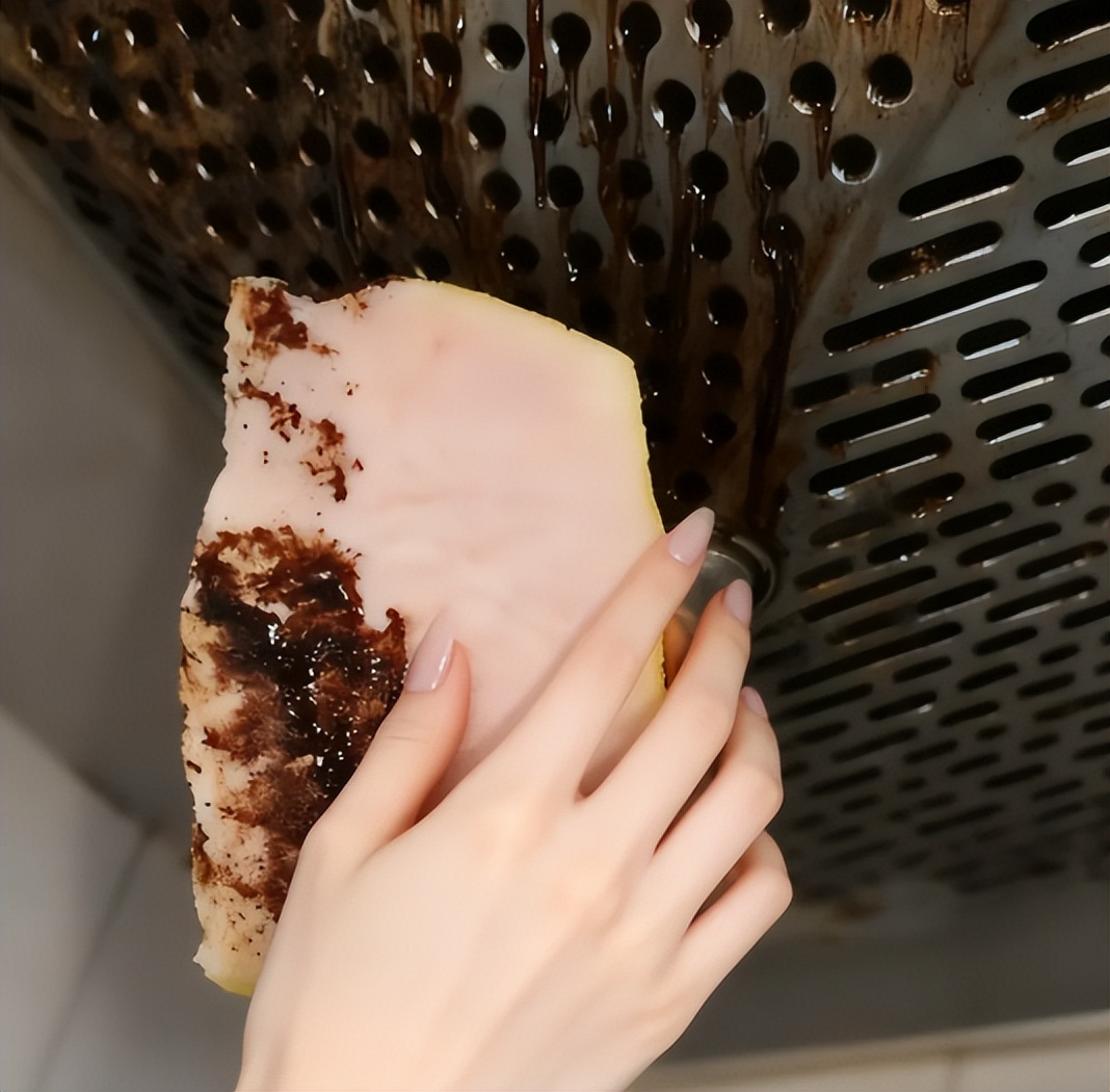 把柚子皮剪开之后,瓤的那一部分对准油污擦一擦,就可以把油污擦掉了,比抹布还好用。