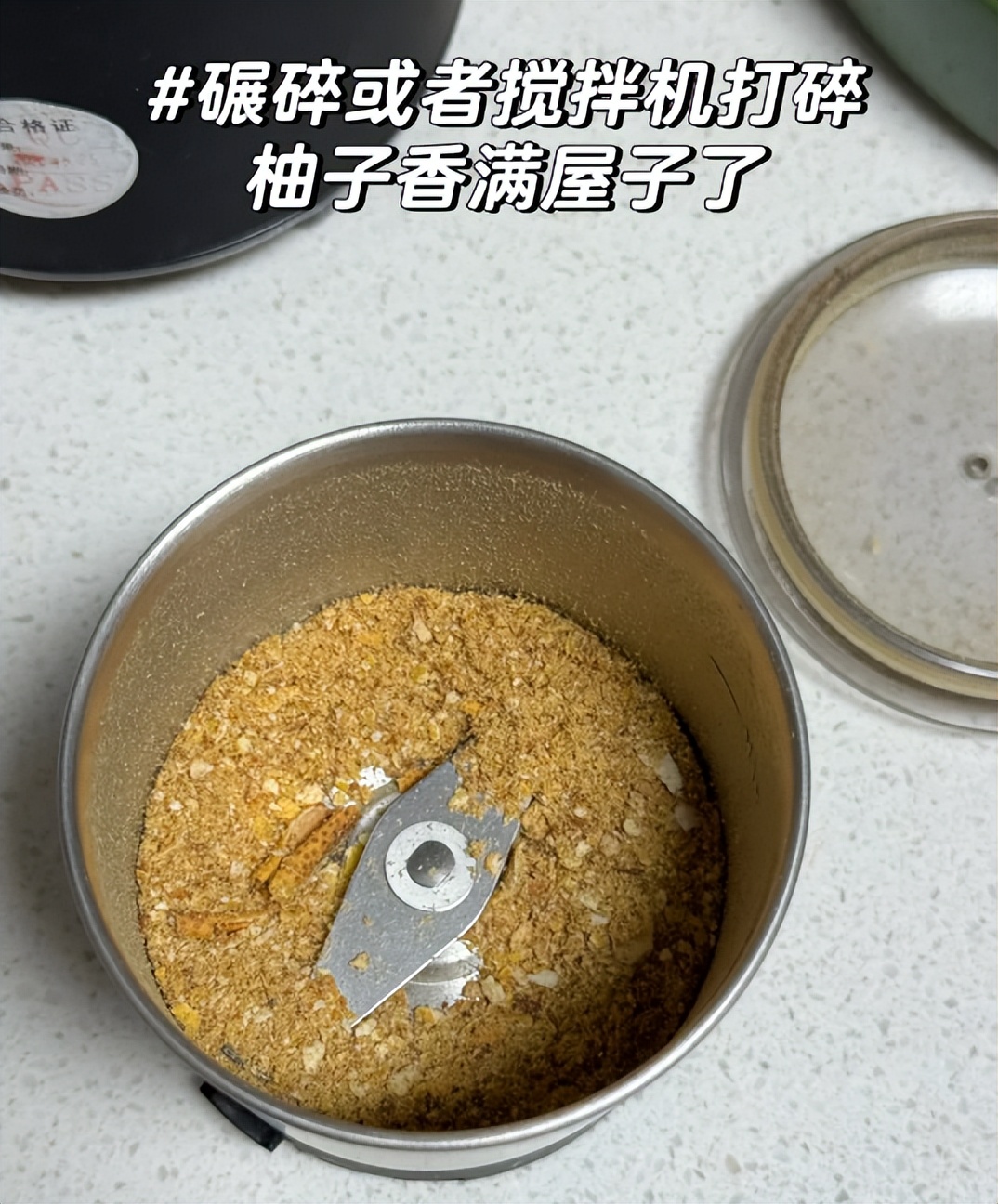 晒干或者烤干后的柚子皮用破碎机打碎,打碎之后满屋子都是柚子的清香。