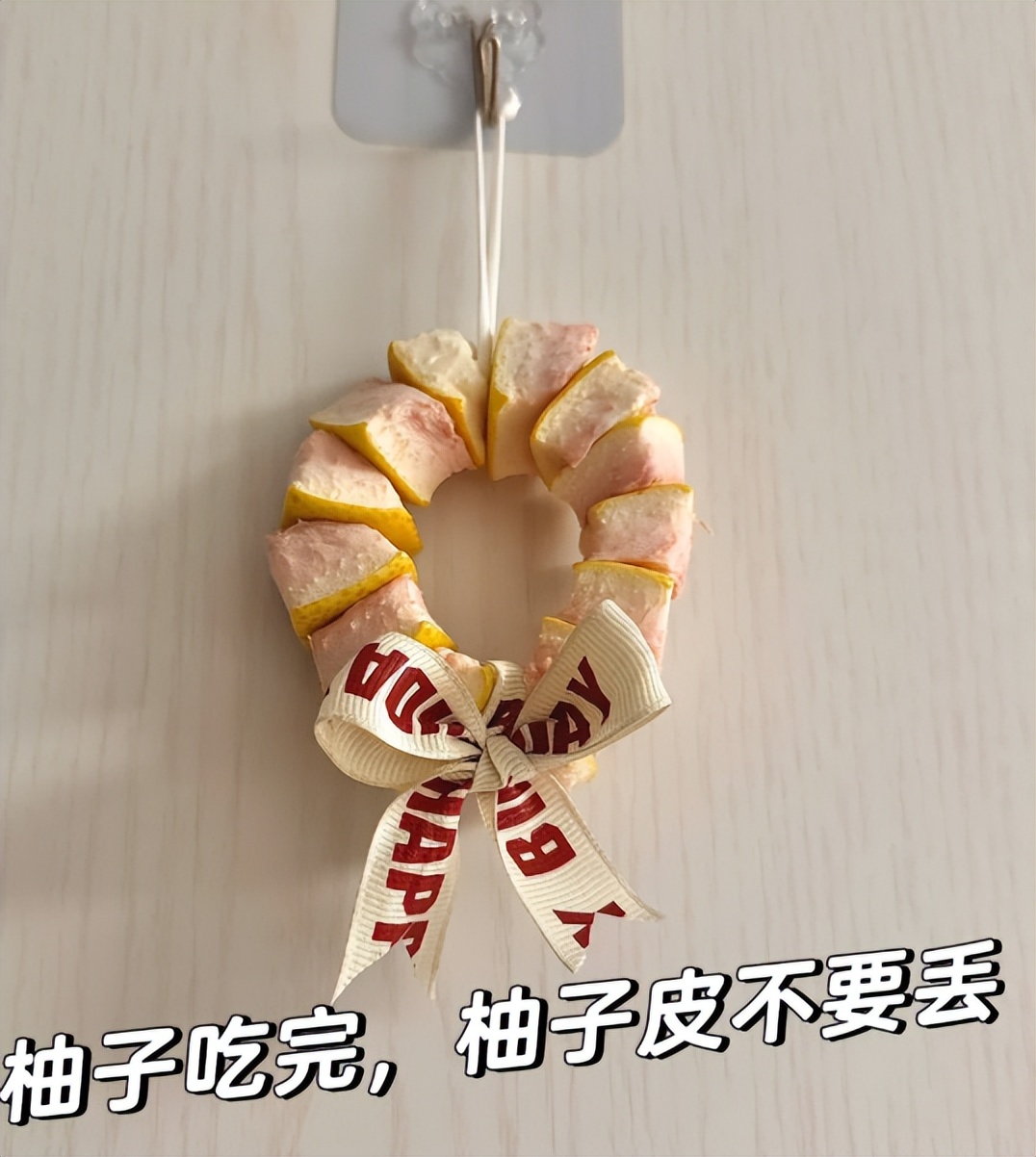 吃完的柚子皮切成大块,用绳子串联在一起,直接挂在家里,就是一个香薰挂件。