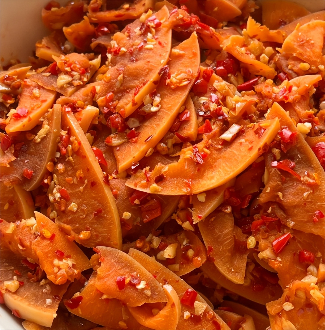 把配料和柚子皮拌匀,腌制半小时左右就可以吃了,腌制好的柚子皮,酸酸辣辣的,特别开胃。