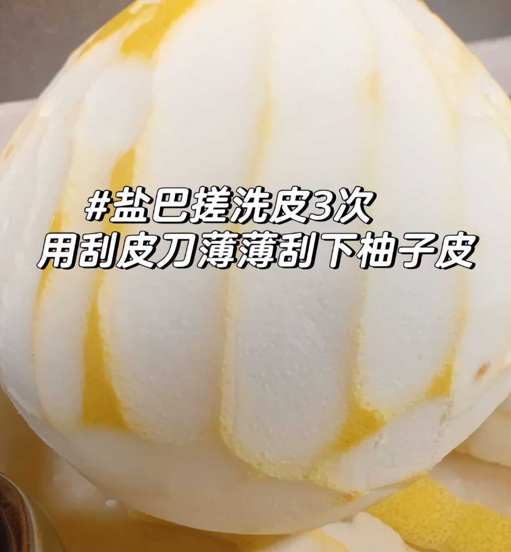 柚子皮需要用盐巴搓洗几次,这样才可以去掉柚子的苦味和涩味,再用刮皮刀薄薄的把柚子皮刮下来。