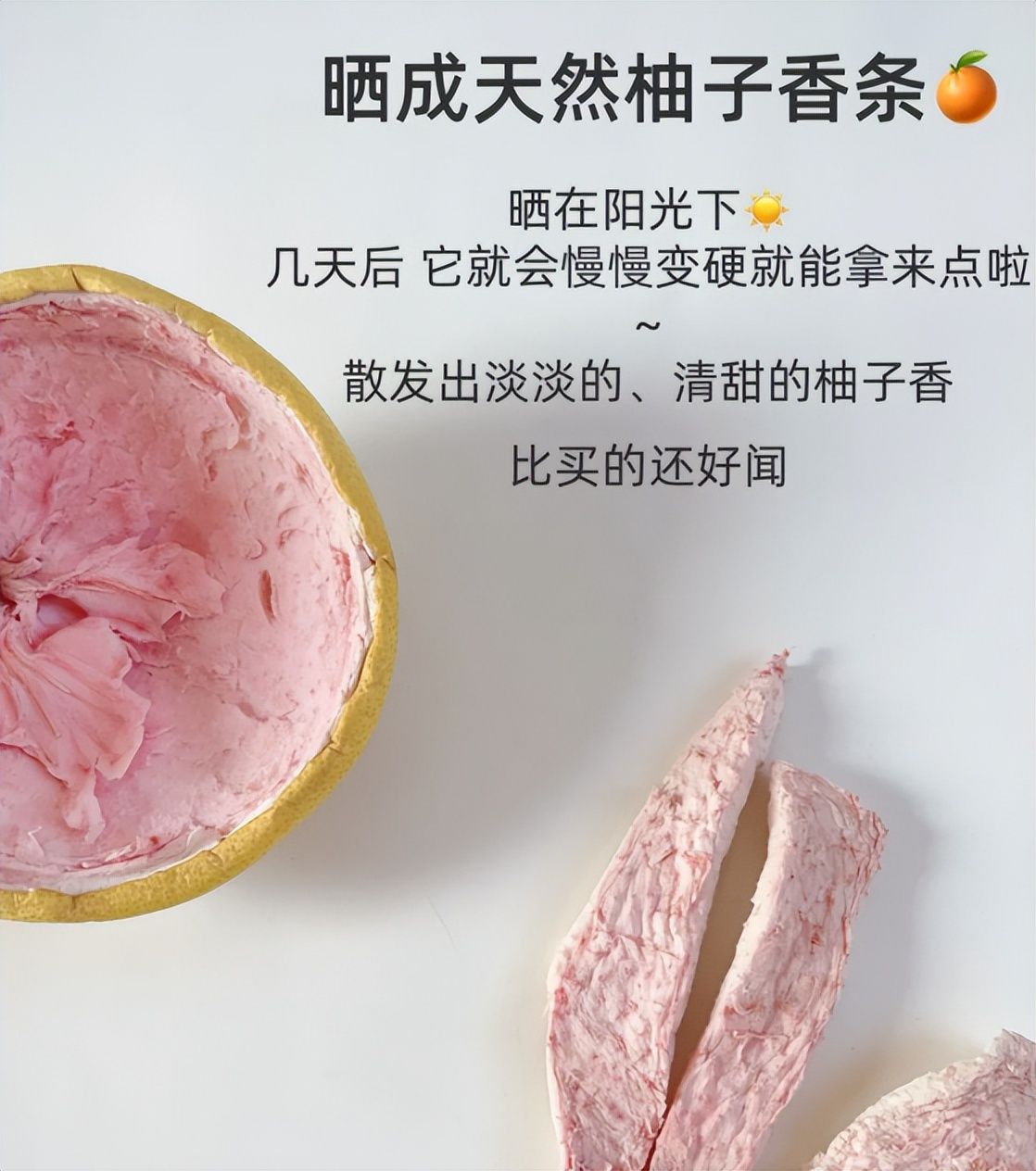 如果家里有吃完的柚子皮,那么可以把柚子做成香条,只需要把它放在阳光下晒几天,光是晾晒的过程中,它就会释放出淡淡的柚子香。