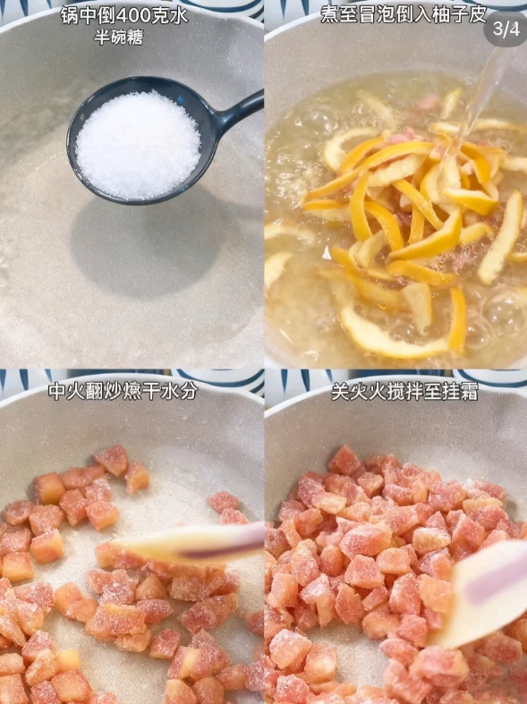 锅中倒入400克水,加入半碗糖,再把刚才切好的柚子皮倒进去,中火翻炒至没有水分,关火搅拌挂上糖霜就可以了。
