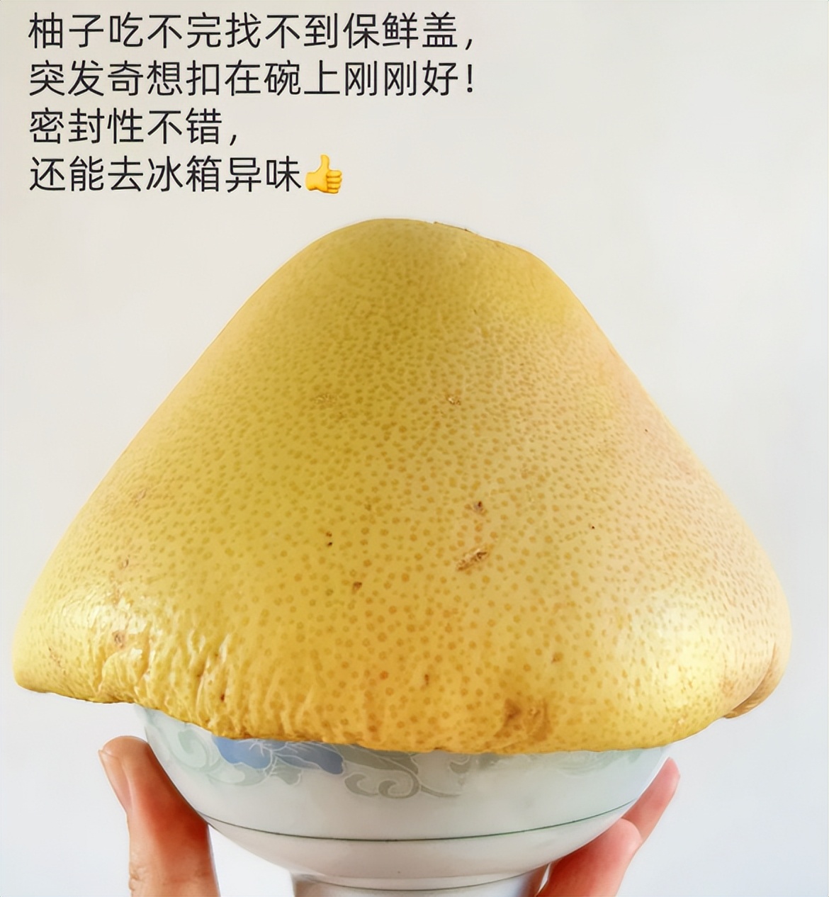 碗里面如果有食物的话,找不到保鲜盖,可以把吃完的柚子皮直接扣在上面。
